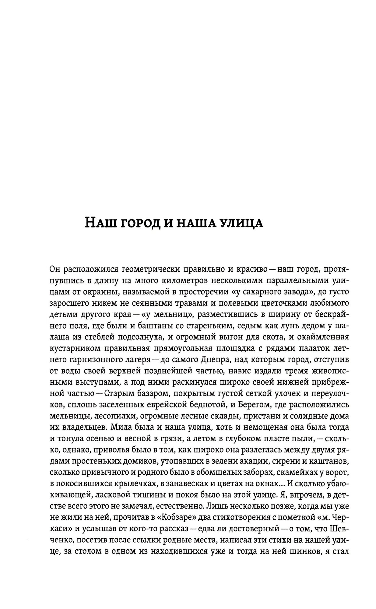 Воспоминания адвоката, журналиста, впоследствии экономиста В.Л. Житомирского (1884-1960) посвящены жизни его семьи в небольшом уездном городе Черкассы Киевской губернии в конце XIX - начале XX в. Образ жизни семьи строго религиозного толка, живущей в черте еврейской оседлости, обычаи, праздники, бывшие неписаной основой семейного быта, устройство дома и двора, образование детей, торговой дело, благотворительность и взаимопомощь жителей нашли свое описание на страницах книги. В выразительном рассказе о событиях 1917-1920 гг. отразилось бурная история тех лет: наступление политических свобод в феврале 1917 г., работа в новых демократических органах власти, оборвавшаяся с приходом гетманщины, оккупация Черкасс немецкими войсками, погромы, арест, тюрьма и угроза расстрела деникинской армией. Воспоминания В.Л. Житомирского публикуются впервые.