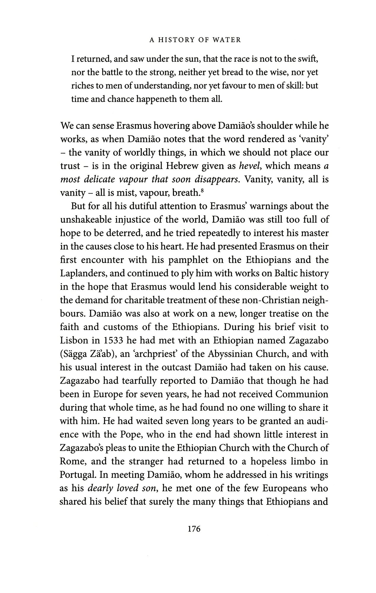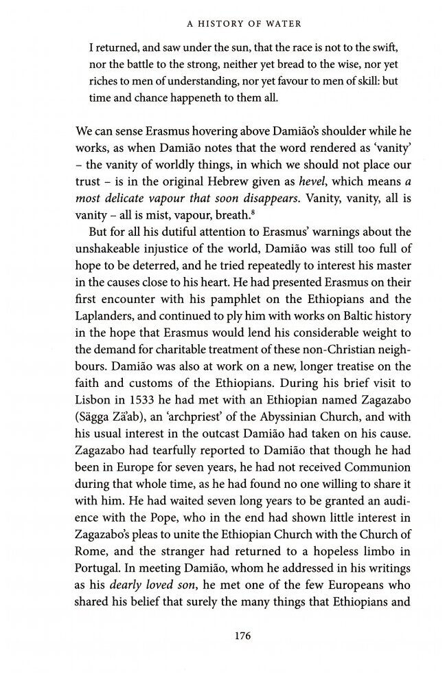 A History of Water follows the interconnected lives of two men across the Renaissance globe. One of them – an aficionado of mermen and Ethiopian culture, an art collector, historian and expert on water-music – returns home from witnessing the birth of the modern age to die in a mysterious incident, apparently the victim of a grisly and curious murder. The other – a ruffian, vagabond and braggart, chased across the globe from Mozambique to Japan – ends up as the national poet of Portugal.