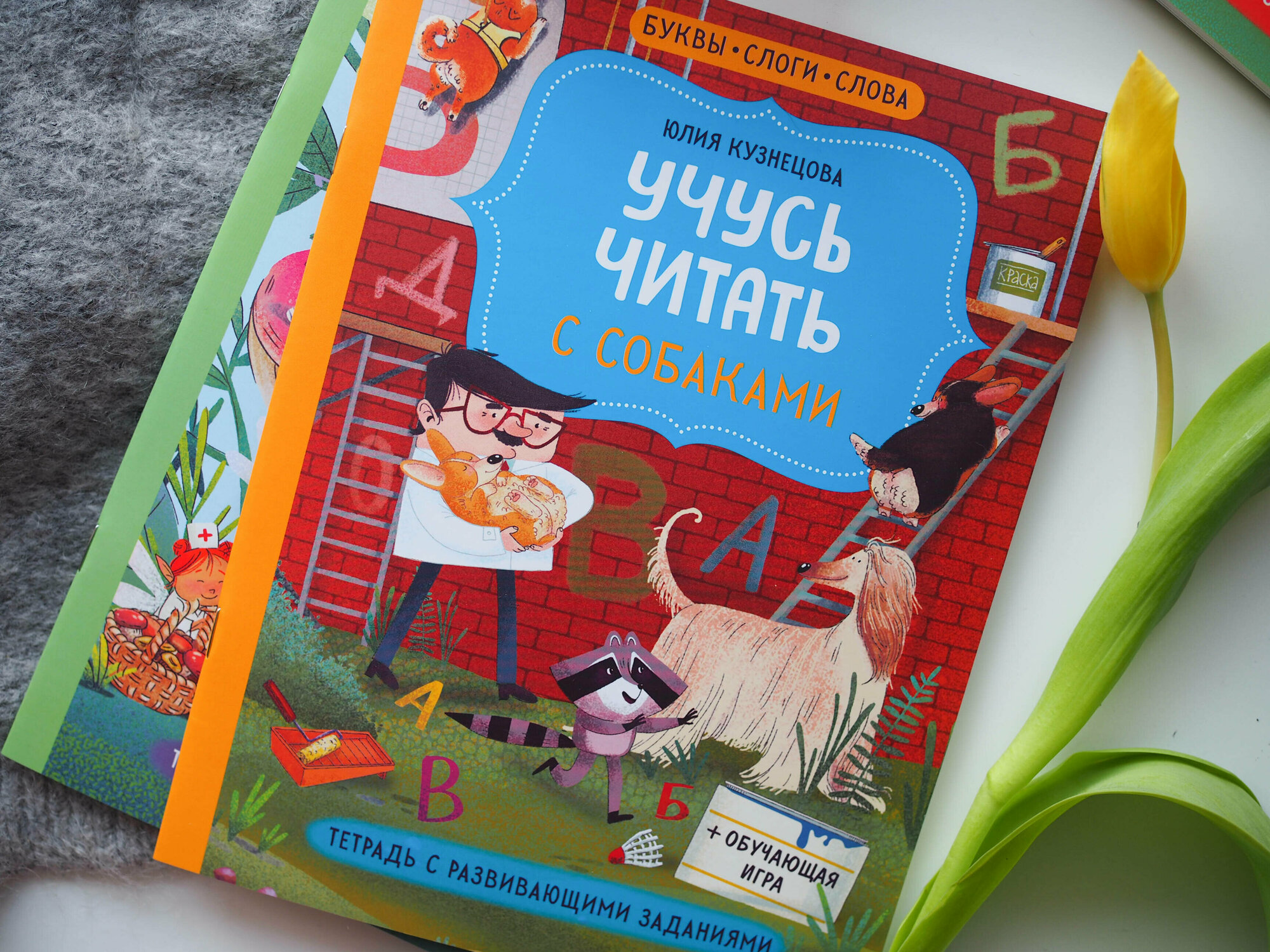 Собаки! Речь об очередной тетради с развивающими заданиями издательстве МИФ и Юлии Кузнецовой. Примерно полгода назад дочка занималась по первым двум — «Учусь читать с кошками» и «Учусь читать с динозаврами». Сейчас у нас третья — «Учусь читать с собаками».