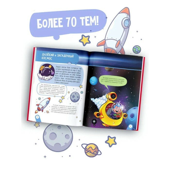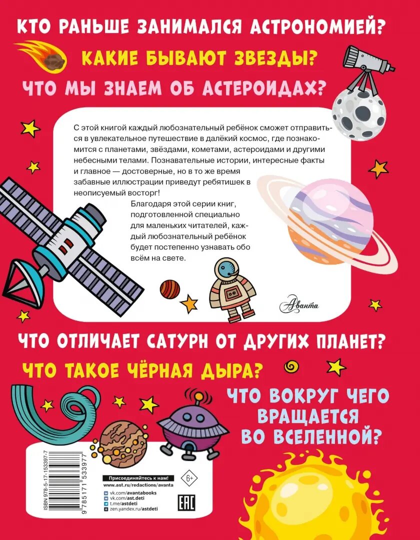 Маленький читатель получит ответы на множество вопросов: какая наука изучает звёздное небо и что скрывается под таким загадочным словом, как гравитация, как возникает Солнечное затмение и чем оно отличается от лунного, какая звезда согревает нашу планету и как называется галактика, в которой мы живём, и, конечно же, он узнает о том, кто первым из людей полетел в космос. Текст книги написан интересным, а главное, понятным и доступным языком — специально для дошколят. А красочные иллюстрации непременно понравятся детишкам: созвездия, планеты, другие небесные тела представлены на них очень достоверно и в то же время забавно. Итак, открывайте книгу и поскорее начинайте путешествие в бесконечный и такой удивительный мир космоса!