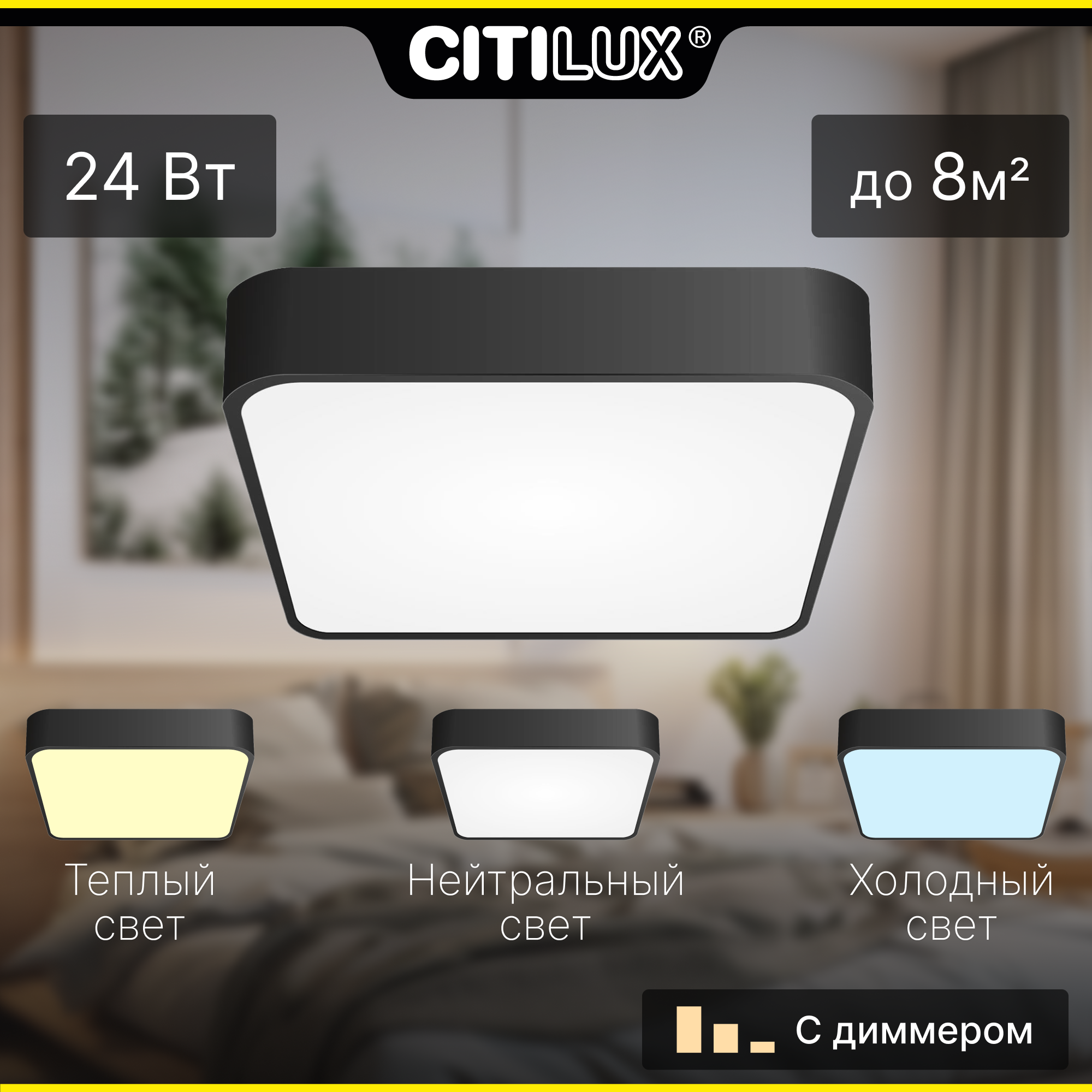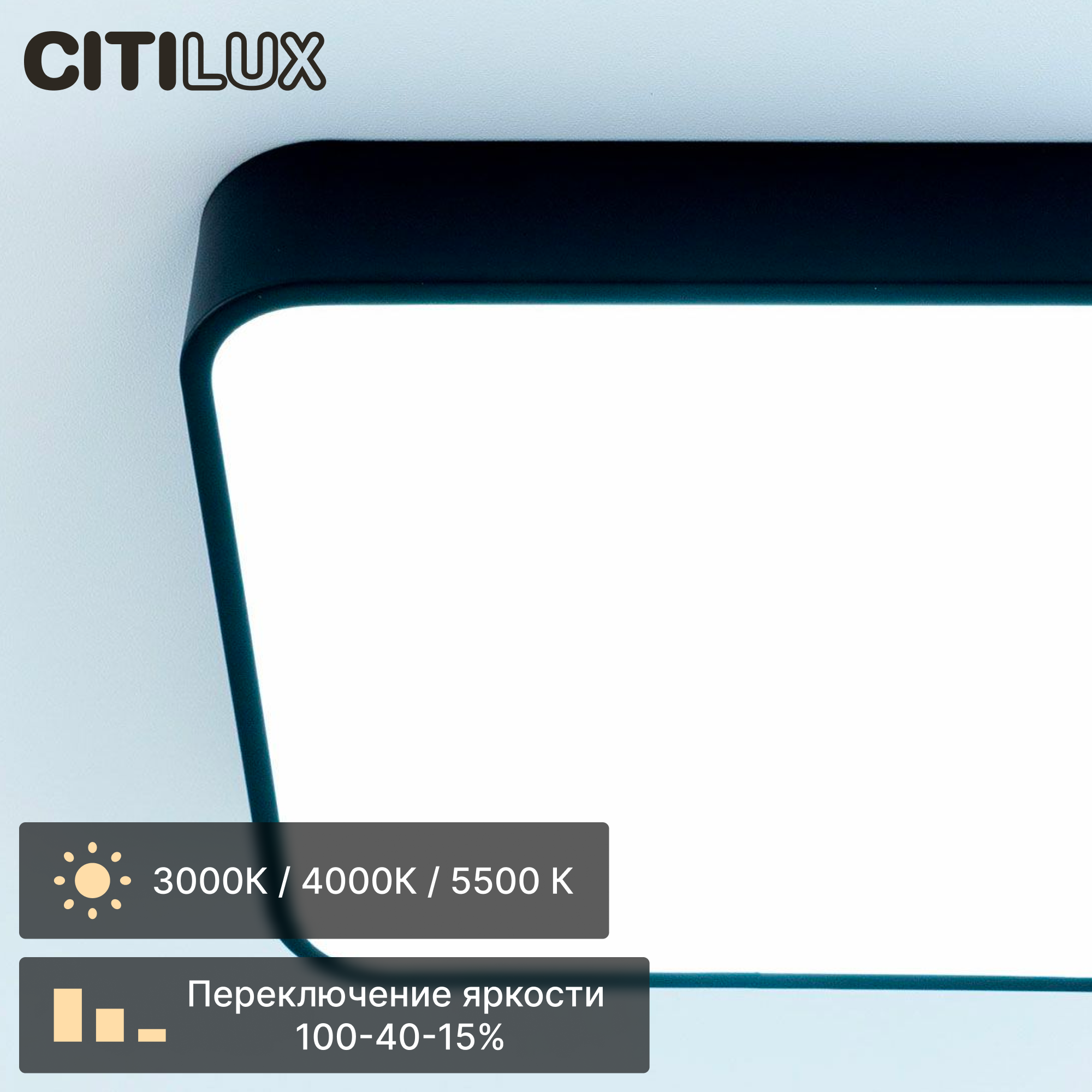 Потолочный светодиодный светильник Citilux Купер CL724K24V1 в современном стиле минимализм. Корпус металлический, квадратной формы, цвет чёрный матовый. Рассеиватель из оптического полимера. Светильник оснащен встроенным 3-х ступенчатым диммером 100-40-15% яркости, управляется настенным выключателем. Переключатель цветовой температуры, расположенный на блоке питания, позволяет при монтаже установить режим - 3000-4000-5500К (тёплый, нейтральный или холодный свет). Мощность 24Вт, световой поток 1900Лм, индекс цветопередачи больше 80 CRI. Свет без мерцаний и пульсаций, что обеспечит защиту здоровья ваших глаз. Подходит для всех типов потолков, в том числе натяжных. Тип крепления – через основание.