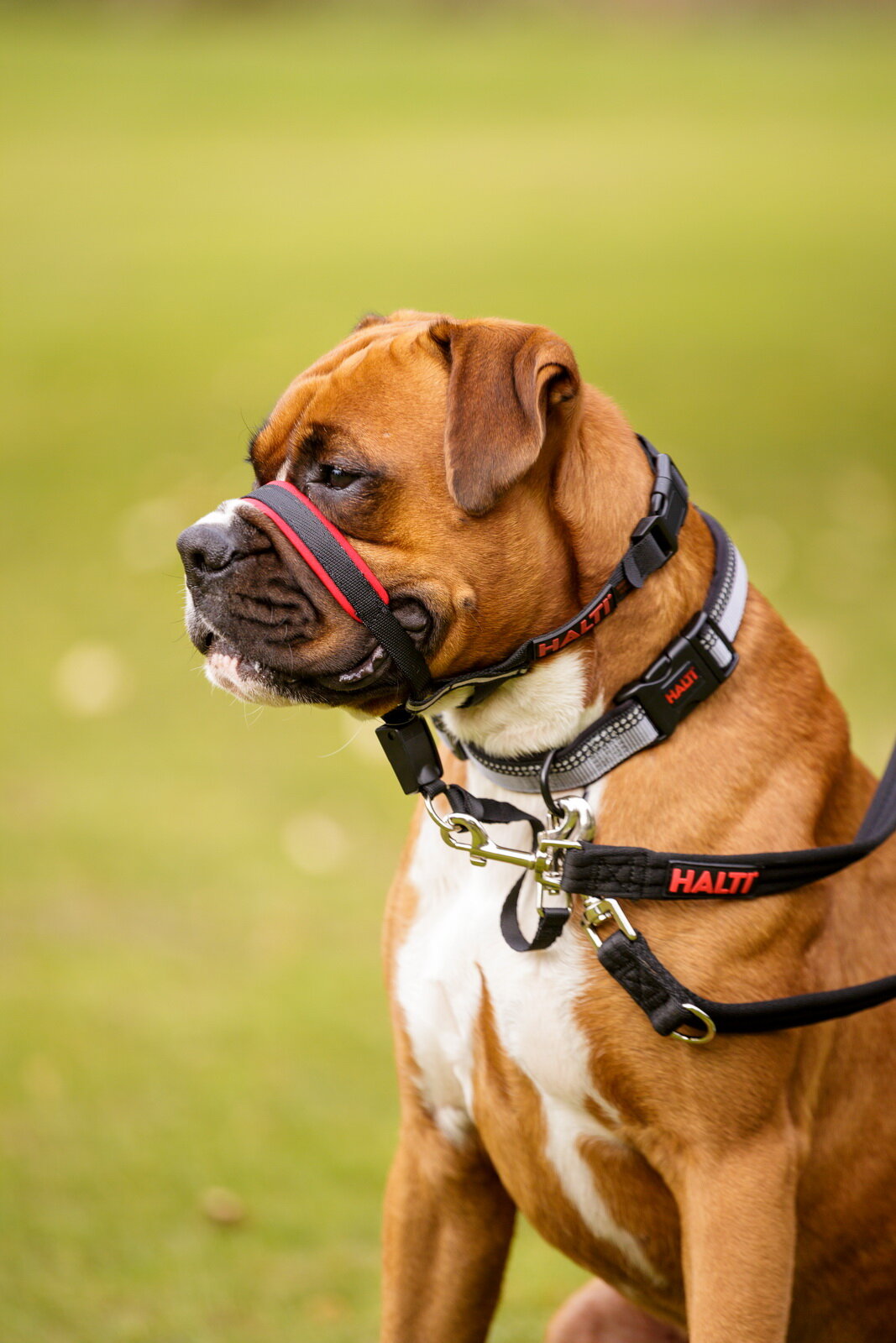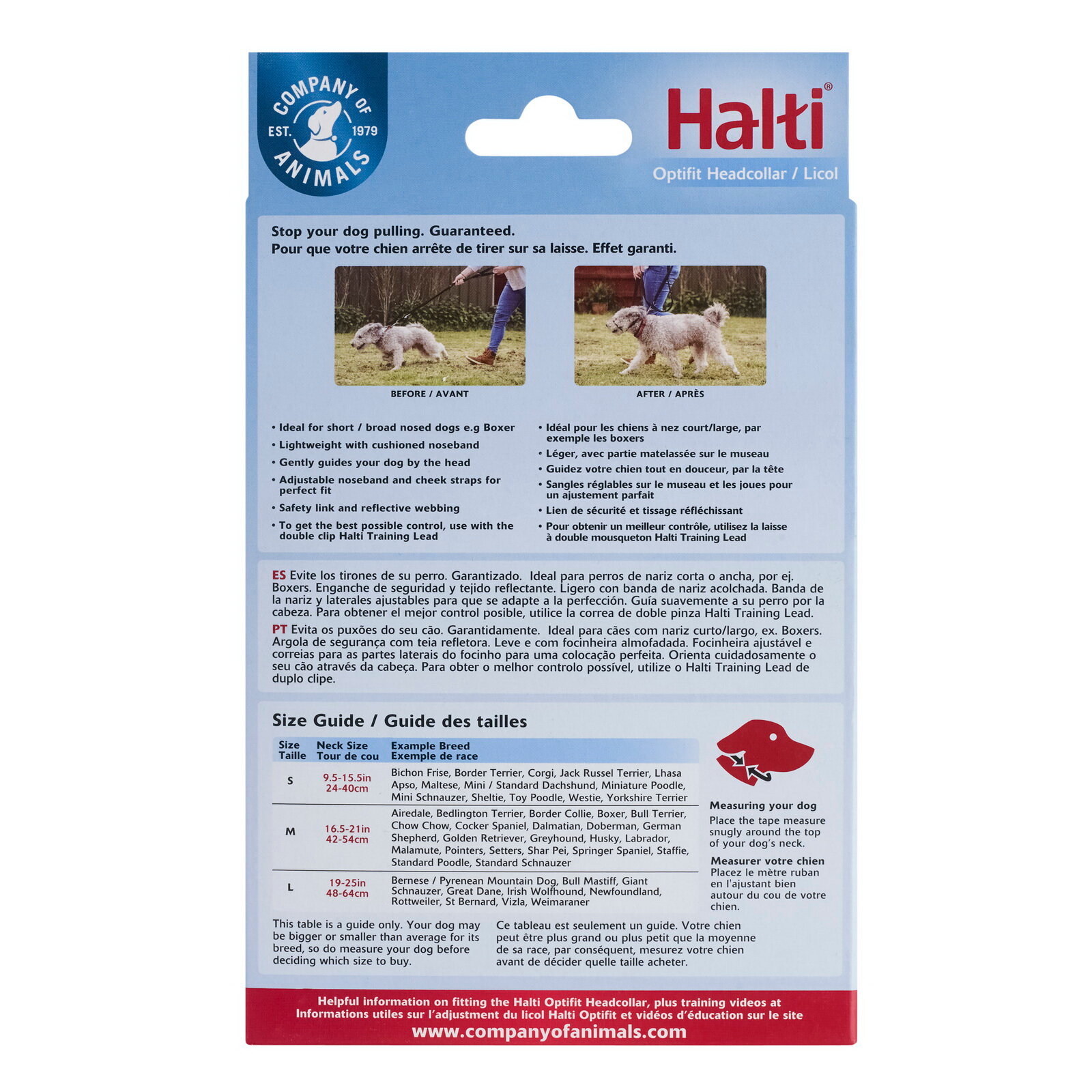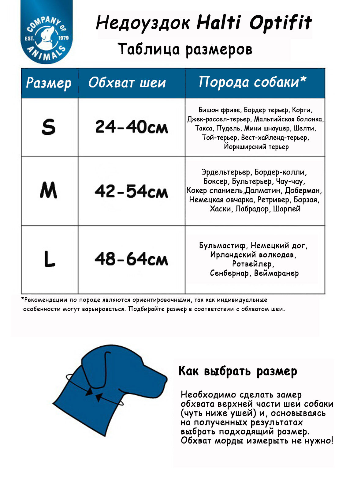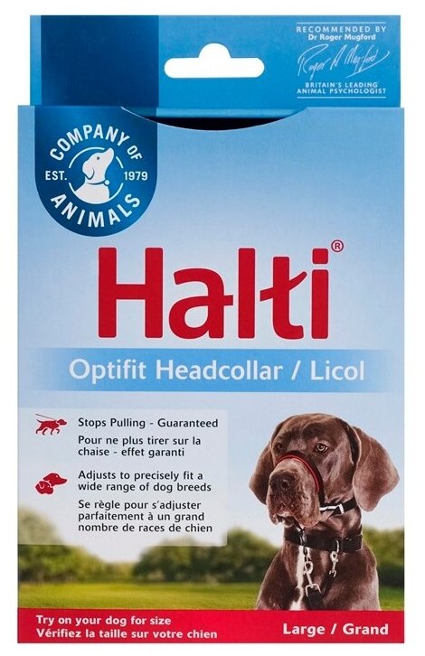 Недоуздок Halti OptiFit (с дополнительным фиксатором), является улучшенной версией недоуздка Headcollar. Если вы хозяин собаки, которая любит тянуть, то вы как никто знаете, насколько это может быть опасно. Бренд Halti был разработан зоопсихологом, доктором Роджером Магфордом для решения этой проблемы. Его революционный дизайн основан на том же принципе, что и недоуздок лошади, если вы направите голову собаки, то тело последует за ним. Недоуздок состоит из нескольких нейлоновых ремешков, сшитых между собой. Носовой ремешок, сделанный в виде петли с мягкой подкладкой из неопрена, соединен с шейным с помощью двух светоотражающих ремешков, удобная пластиковая защелка быстро фиксирует изделие на голове собаки, а фиксатор под мордой позволяет подогнать под нужный размер по обхвату морды. Металлическое кольцо объединяет концы носового ремешка и к нему крепится поводок, на конце изделия карабин для дополнительной фиксации к ошейнику. Недоуздок Halti OptiFit - аксессуар не для свободных прог