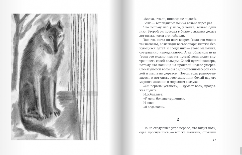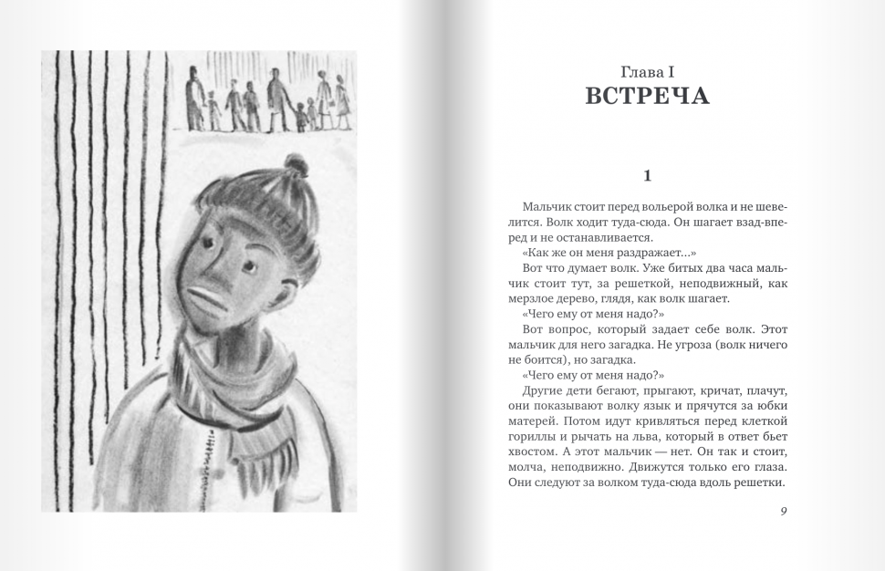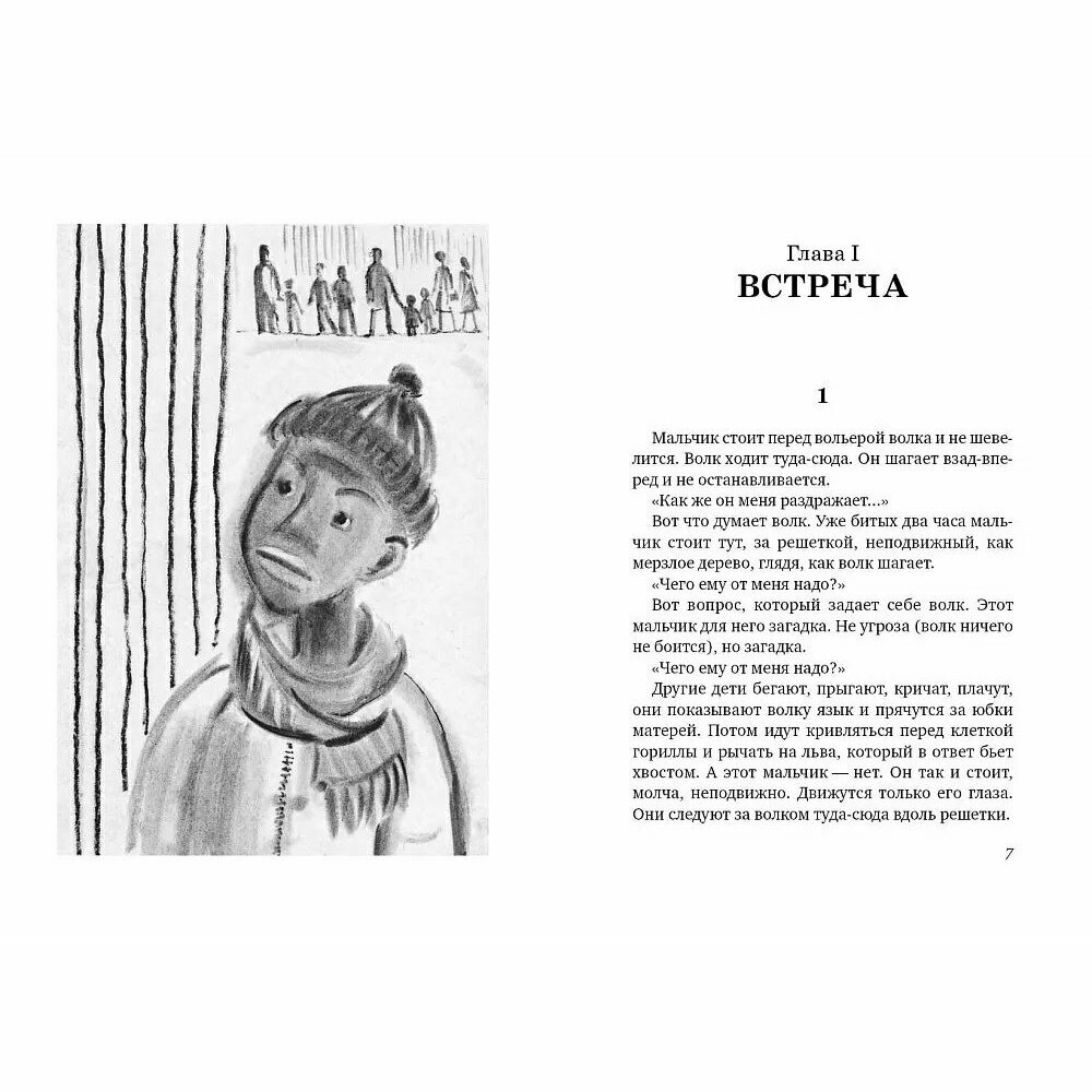 Книга начинается очень интересно. Мальчик стоит перед вольером одноглазого волка в зоопарке и не шевелится. Волк нервно ходит туда-сюда. Он шагает взад-вперед и не останавливается - его раздражает мальчик. Он не понимает, что тому нужно. Так продолжается на протяжении нескольких дней. Однажды мальчик делает странную вещь, которая успокаивает волка и создает между ними доверие. Как вы думаете, что сделал мальчик?