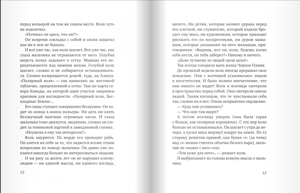 В Парижском зоопарке происходят невероятные события: одноглазый полярный Волк и маленький африканский мальчик молча рассказывают друг другу истории, одна удивительнее другой. В двух зрачках - мальчишечьем и волчьем - мелькают, сменяя друг друга, заснеженная Тундра, желтая, серая и зеленая Африки. Где-то там, в прошлом, звучат выстрелы, раздаются крики, шум пропеллеров и вой шакалов, вспыхивают золотые блестки и дождь обволакивает джунгли. Волк и мальчик пристально смотрят друг на друга. И чем больше узнают друг друга, тем яснее понимают, что будь ты волком или мальчиком, верблюдом или гепардом - если тебе хватило терпения и мудрости услышать историю чужого сердца и откликнуться на нее, ты больше не одинок. Оставаясь по разные стороны решетки зоопарка, Волк и мальчик по имени Африка сломают клетку недоверия и подозрительности - клетку, в которой может очутиться каждый и из которой не выбраться поодиночке.