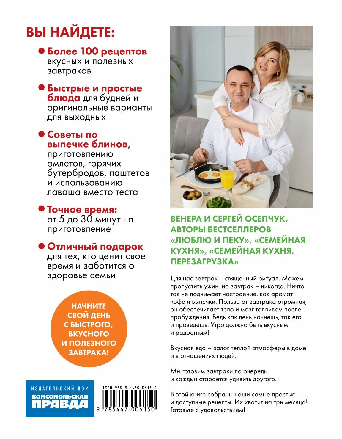 Завтрак как священный ритуал для авторов книги, неутомимых кулинаров Венеры и Сергея Осепчук. "Можем пропустить ужин, но завтрак - никогда. Польза от завтрака огромная, он обеспечивает тело и мозг топливом после пробуждения. Вкусная домашняя еда - залог теплой атмосферы в доме и в отношениях людей". В новой книге более 100 рецептов быстрых, вкусных и полезных завтраков: разные виды омлетов, глазуний и запеченных яиц, блины, оладьи, каши, сэндвичи, вафли, завтраки с йогуртом и паштетами. Потрясающие идеи и полезные советы, впрочем, как и всегда у авторов бестселлеров "Семейная кухня" и "Люблю и пеку". Все рецепты проверены и одобрены подписчиками блога. Каждый найдет лакомство по душе, причем из доступных продуктов, которые всегда есть в холодильнике. Рецептов хватит на 3 месяца! Подарите себе и родным вкусный завтрак, приготовленный с любовью. Пусть ваш день удается с самого утра.