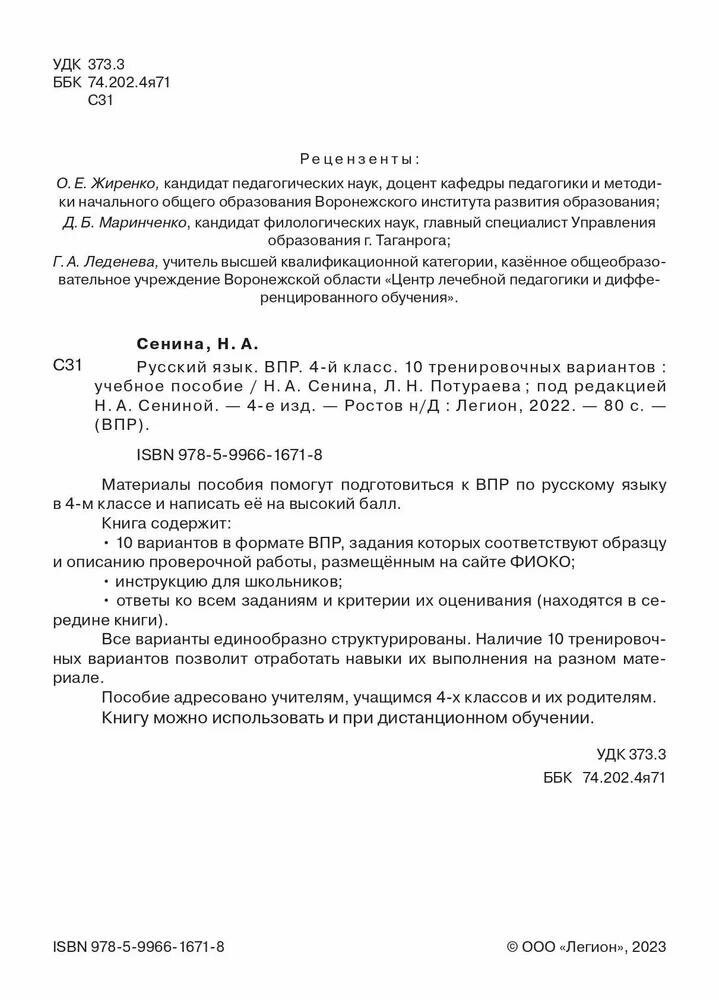 Русский язык. 4 класс. ВПР. 10 тренировочных вариантов (Сенина Наталья Аркадьевна, Потураева Любовь Николаевна); Легион, 2023
