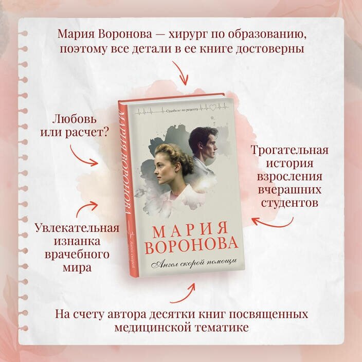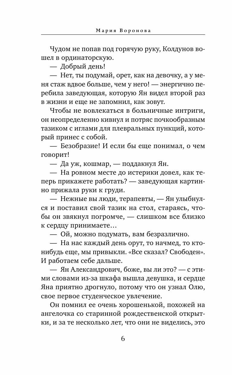С удовольствием приобрела новинку Марии Вороновой, собираю и люблю все ее книги. Пока не начинала читать, любуюсь и предвкушаю удовольствие от прочтения. У автора легкий слог, читается быстро и захватывает сюжет любой книги, домашние дела обычно у меня страдают, когда в руки попадает книга. Всем советую познакомиться с творчеством этой прекрасной писательницы, кто любит современную прозу, да еще и на медицинскую тематику.