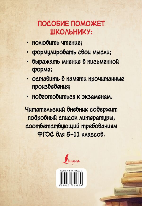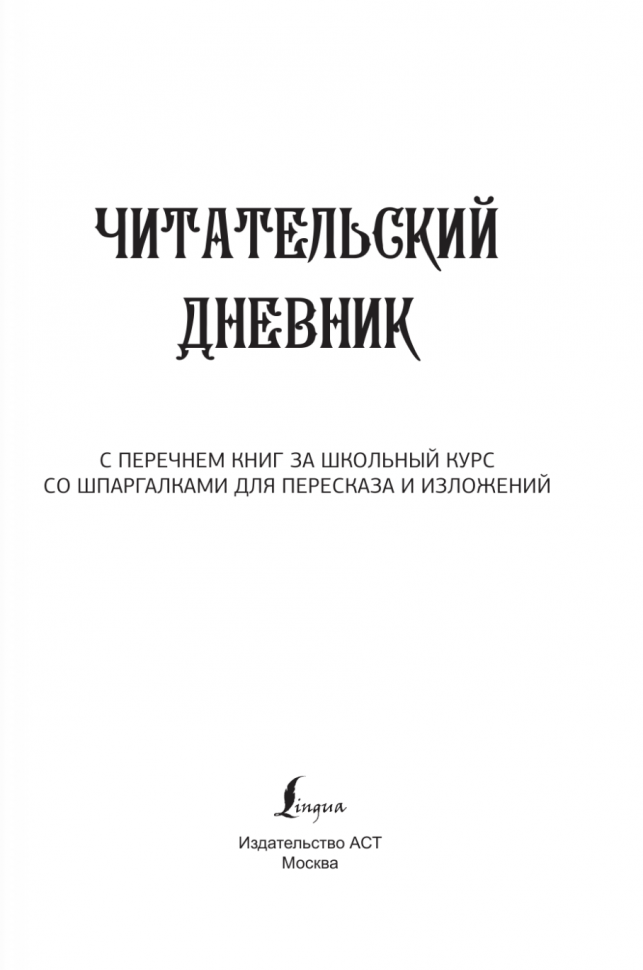 Дневник содержит подробный список литературы, соответствующий требованиям ФГОС для 5–11 классов, который включает не только программные произведения, но и книги на выбор. В конце издания читатель найдёт полезное приложение — шпаргалки для пересказа и изложений, которые помогут школьнику подготовиться к самостоятельной работе на уроках русского языка и литературы. Издание адресовано учащимся средней и старшей школы и подходит для внеклассных занятий.