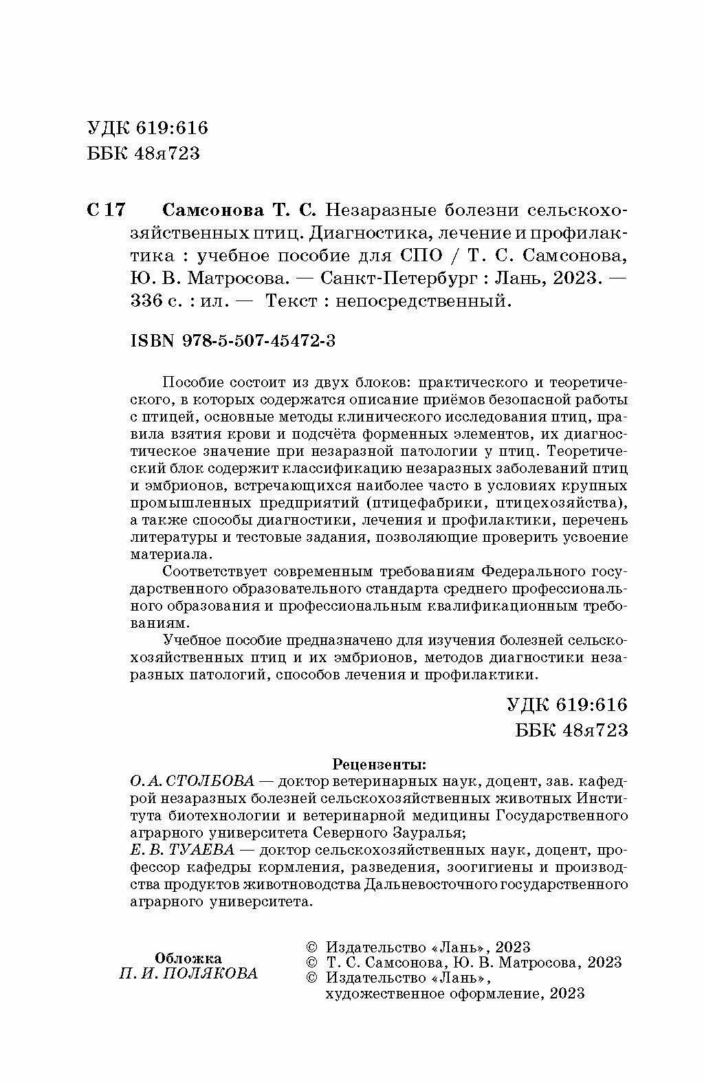 Незаразные болезни сельскохозяйственных птиц. Диагностика лечение и профилактика. Учебное пособие для СПО (Самсонова Татьяна Сергеевна, Матросова Юлия Васильевна); Лань, 2023