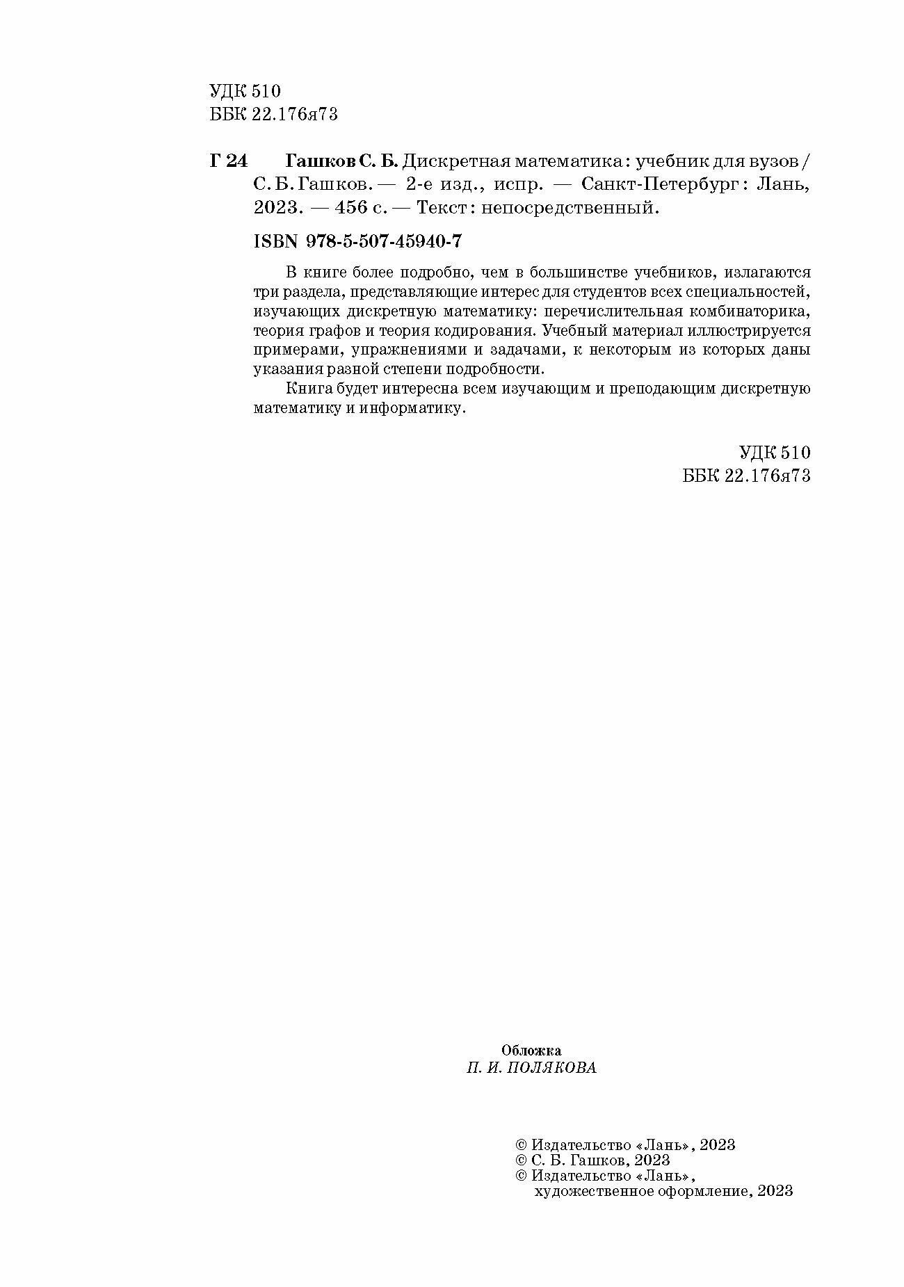 Дискретная математика. Учебник для вузов (Гашков Сергей Борисович); Лань, 2023