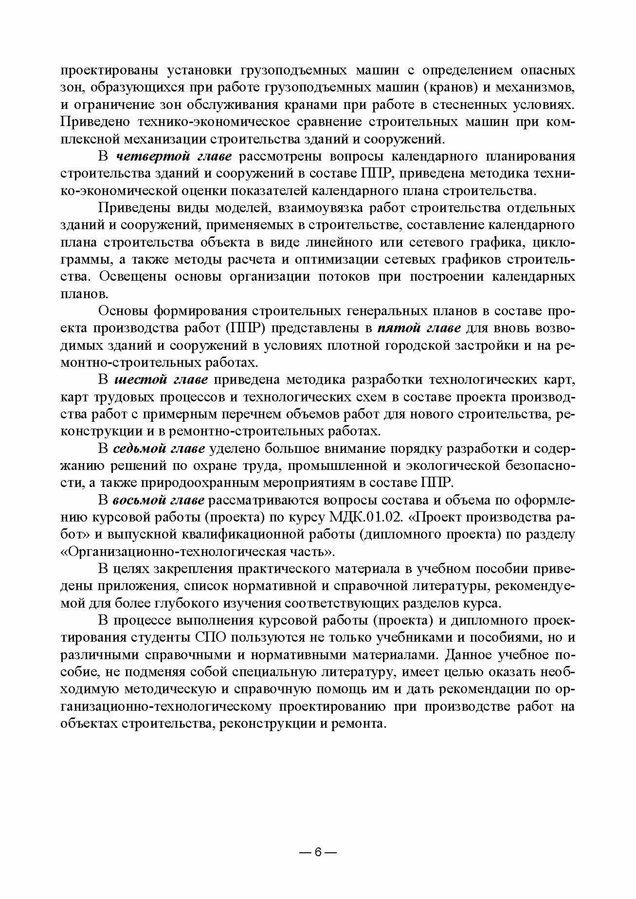 Пособие составлено на основе Федерального государственного образовательного стандарта по специальности среднего профессионального образования «Строительство и эксплуатация зданий и сооружений» по направлению «Техника и технологии строительства» для профессионального стандарта «Организатор строительного производства», на базе междисциплинарных курсов МДК «Проект производства работ» и «Организация технологических процессов при строительстве, эксплуатации и реконструкции строительных объектов», а также профессионального модуля «Выполнение технологических процессов при строительстве, эксплуатации и реконструкции строительных объектов». В учебном пособии в соответствии с ФГОС СПО излагаются вопросы по правилам подсчета объема строительных работ, методике составления проектов производства работ (ППР), производству работ подъемными сооружениями (ППР ПС) и технологических карт (ТК) на строительномонтажные и трудовые процессы при возведении (реконструкции, ремонте) зданий, сооружений и технологии их выполнения. Приводятся наглядные примеры составления проектов производства работ, производства работ подъемными сооружениями (кранами) и технологических карт для строительного производства. Соответствует современным требованиям Федерального государственного образовательного стандарта среднего профессионального образованияи профессиональным квалификационным требованиям. Учебное пособие может быть также рекомендовано для специалистов, работающих в сфере строительства по проектированию проектов производства работ (ППР), производства работ подъемными сооружениями (ППР ПС) и организации строительства (ПОС).