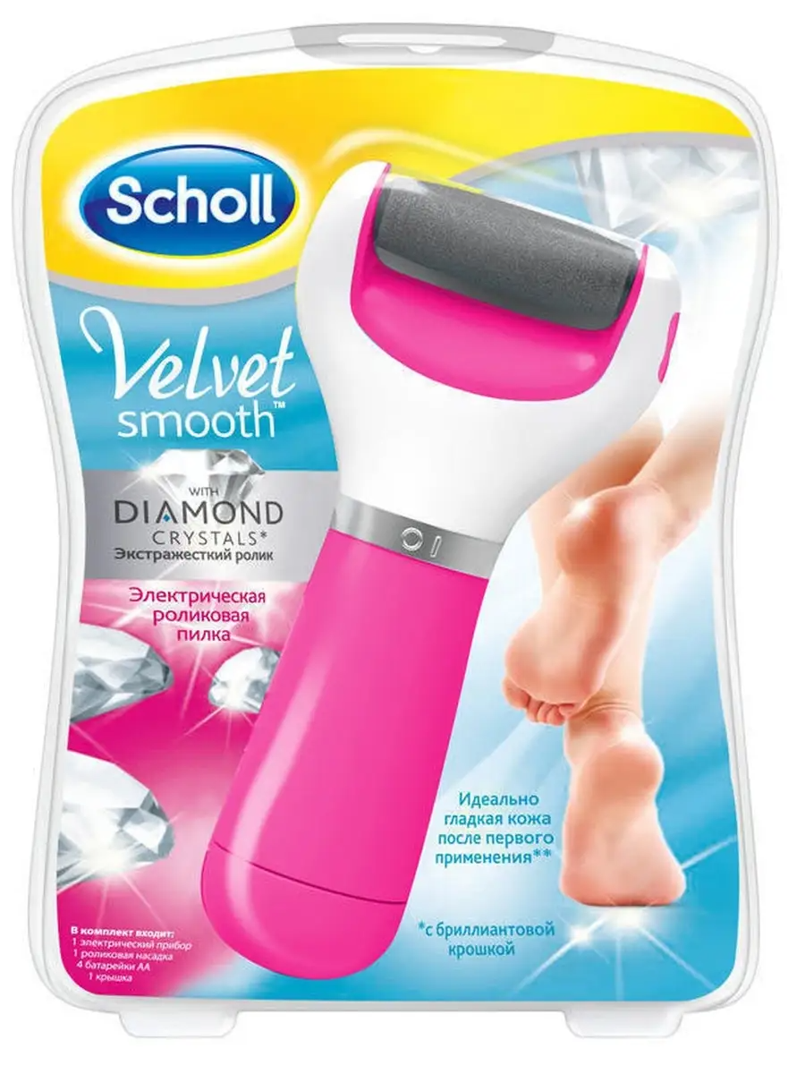 Электрическая роликовая пилка Scholl Velvet Smooth Diamond Crystals мягко удаляет огрубевшую кожу и делает ваши ступни идеально гладкими. Для того, чтобы достичь отличного эффекта достаточно провести роликом по огрубевшим участкам. Благодаря Scholl Velvet Smooth Diamond Crystals вы сможете экономить деньги на походах в салоны. Эффект от Scholl, как от аппаратного педикюра.