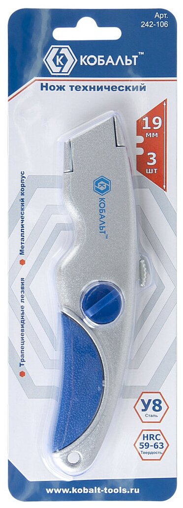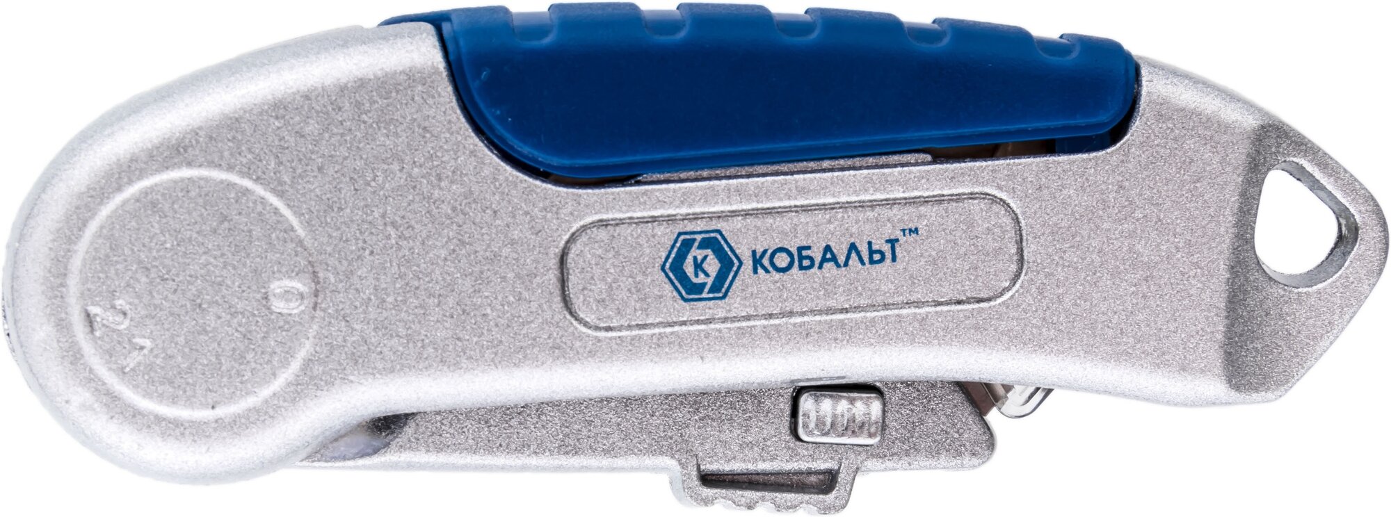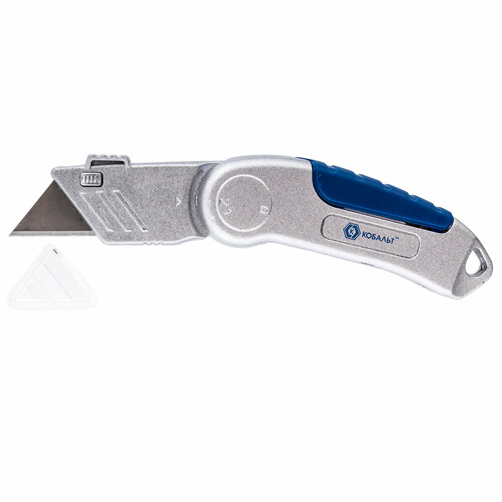 Нож технический складной КОБАЛЬТ с трапециевидными лезвиями 19 мм предназначен для резки обоев, линолеума, картона, бумаги, пленки, резины, пробки, пластика и других мягких листовых материалов. Корпус изготовлен из алюминиевого сплава. Лезвия изготовлены из высокоуглеродистой инструментальной стали У8 с закалкой до твердости 59 HRC. Складная конструкция корпуса наиболее удобна и компактна для хранения и ношения ножа в карманах. В корпусе предусмотрено отверстие для крепления шнура. Ползунковый механизм с автоматической фиксацией лезвия для быстроты и удобства работы. В комплекте 3 двусторонних трапециевидных лезвия размещенных в корпусе ножа.