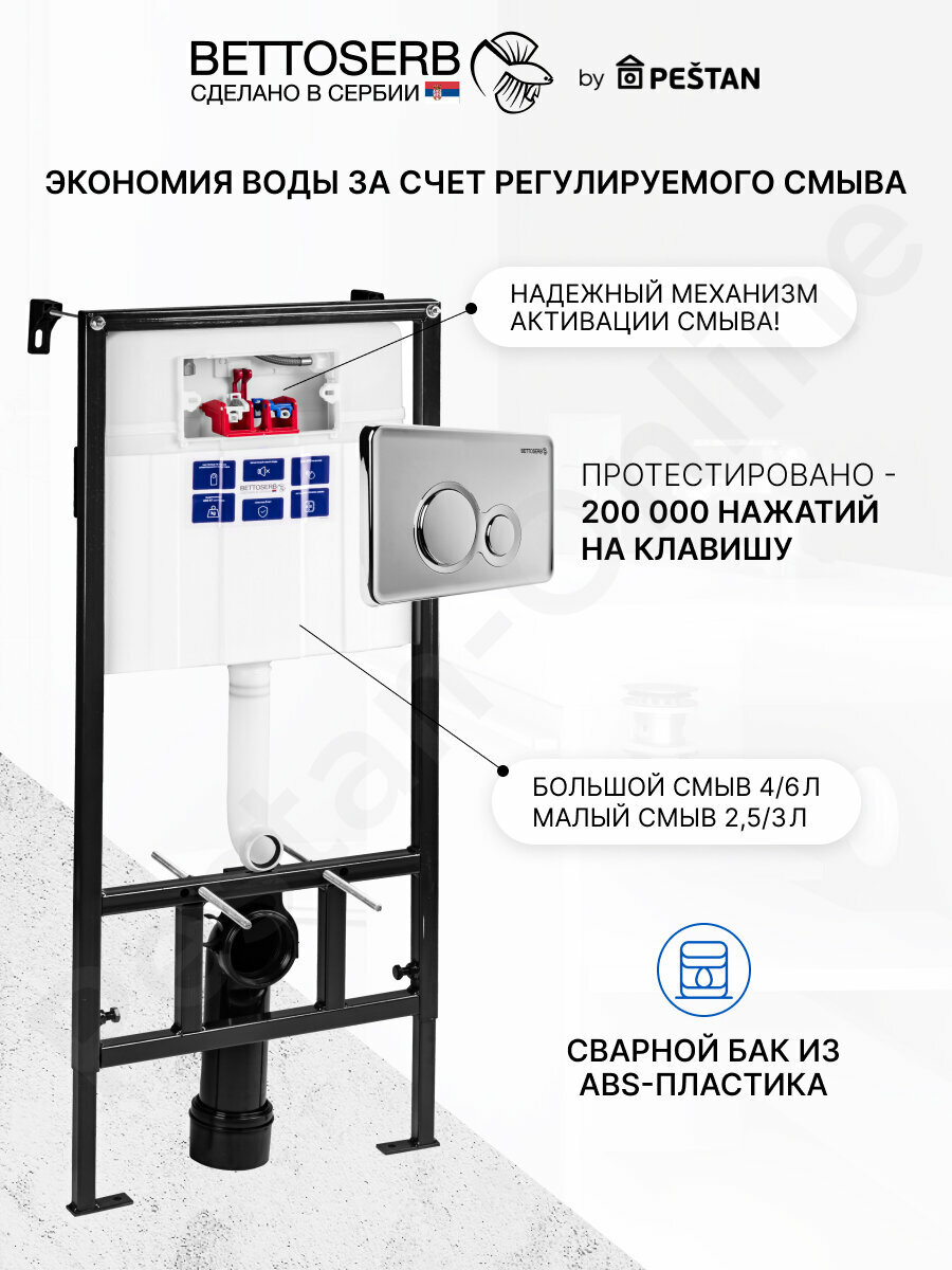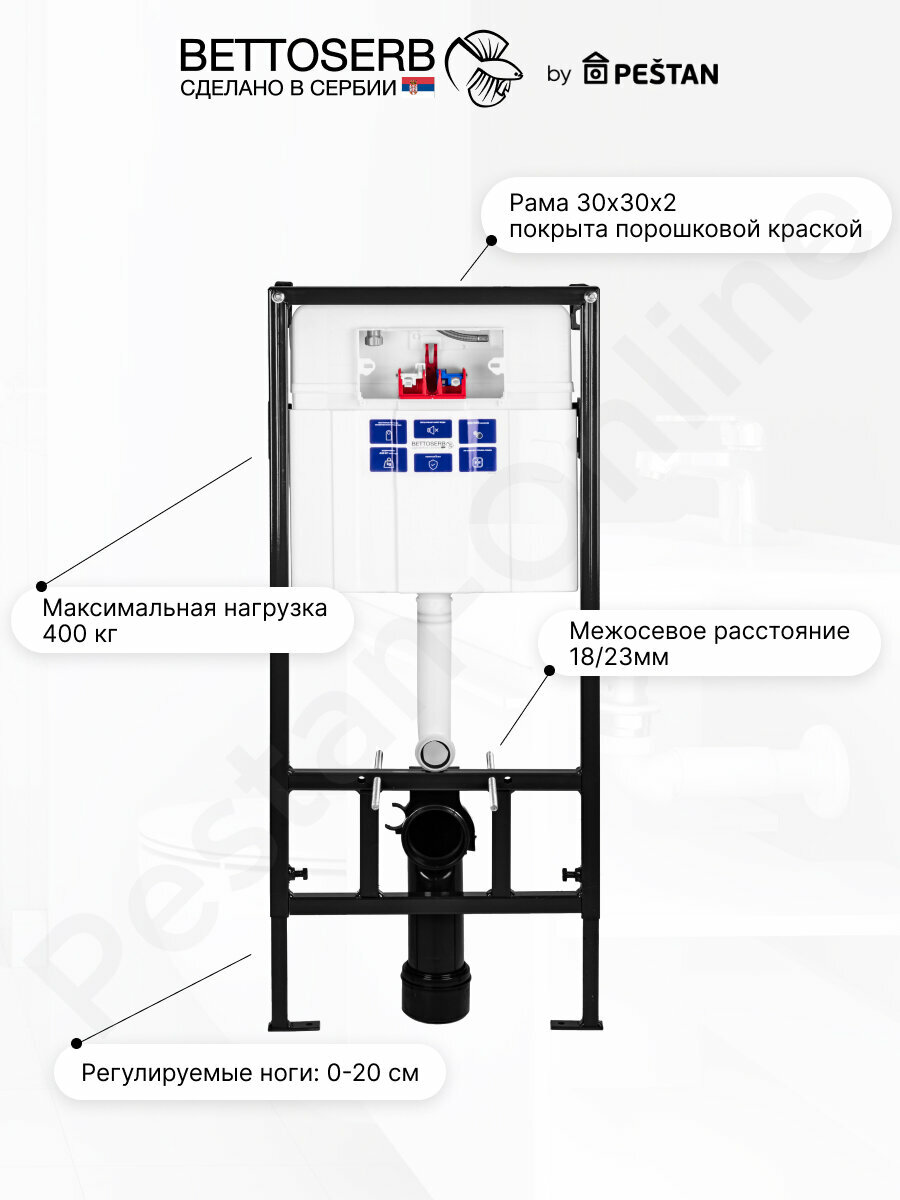 | Комплектация | бачок; звукоизоляционный комплект; инструкция; комплект крепежа; монтажная рама; панель смыва |