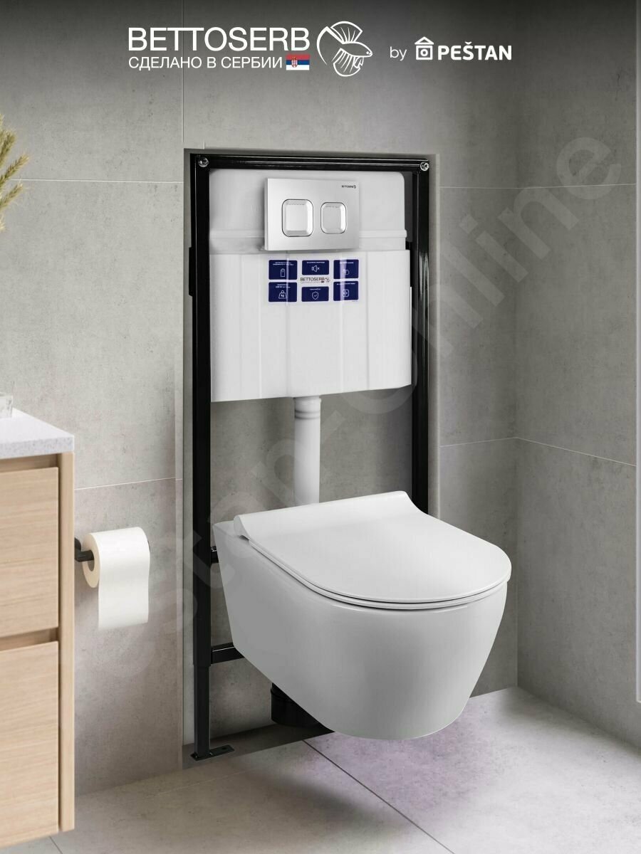 Комплект инсталляция с кнопкой BETTOSERBСистема инсталляции для унитаза Bettoserb – это европейское качество/производство Сербия. Решения для санузла представлены встраиваемой рамой с бачком для унитаза и клавишами смыва. Наши клиенты отмечают надежность рамы для унитаза, функциональность и простоту монтажа инсталляции в ванной, на это есть причины: · Cкрытая инсталляция (скрытая разводка коммуникаций, невидимая установка смывного бака)· Большой выбор дизайнерских кнопок смыва для инсталляции· Надежный механизм активации смыва. Более 200 000 циклов нажатий на кнопку· Подключение к водоснабжению: верхняя средняя/правая сторона· Звукоизолирующая прокладка, бесшумный смыв· Тихий заправочный клапан· Значительная экономия воды· Рама подвесной инсталляции защищена порошковой окраской· Бачок скрытого монтажа, полностью герметизированный от попадания конденсата· Наличие всех необходимых креплений для инсталляции в комплекте· Гарантийные обязательства· Сертифицировано в ЕС