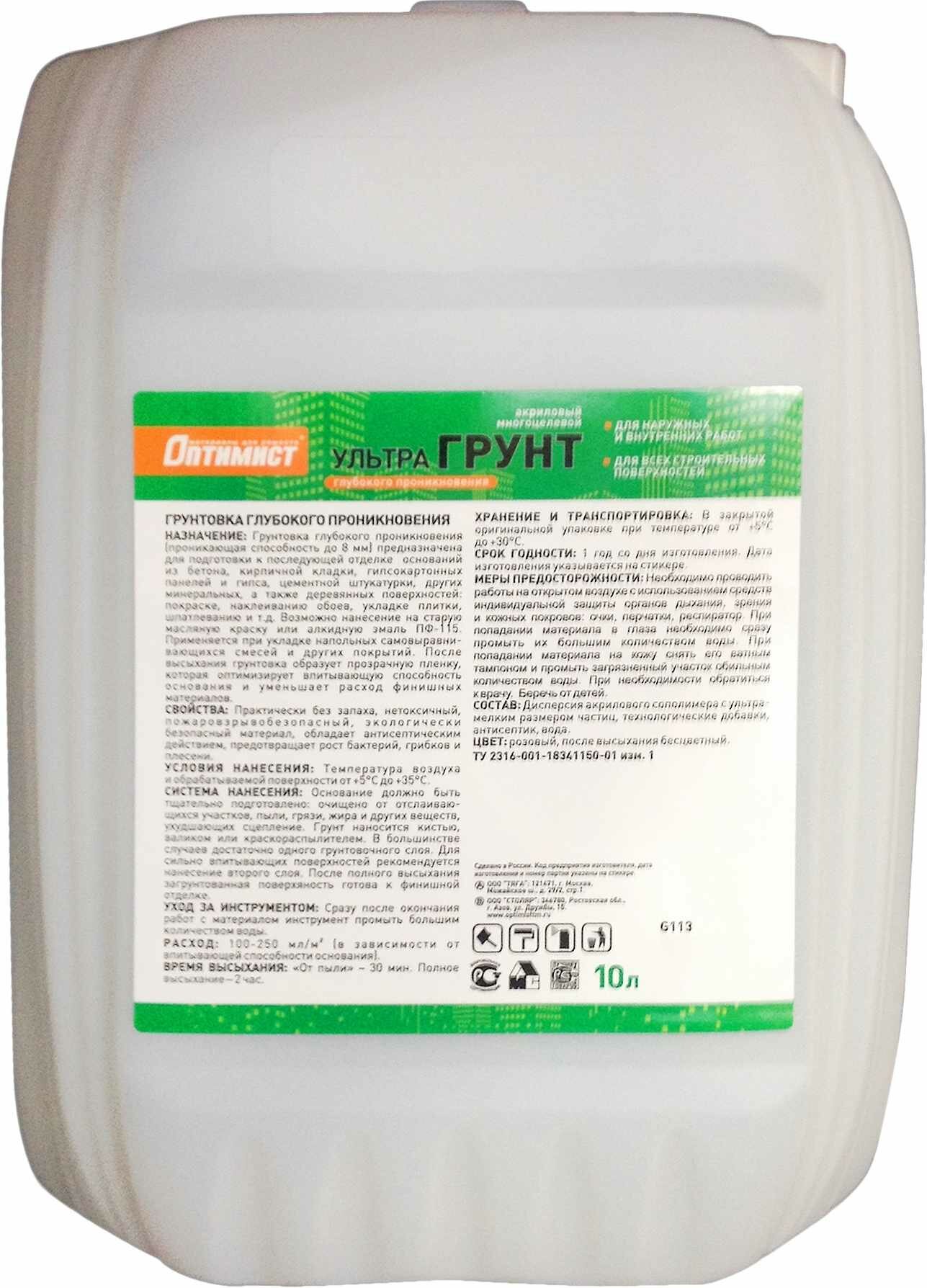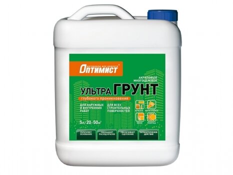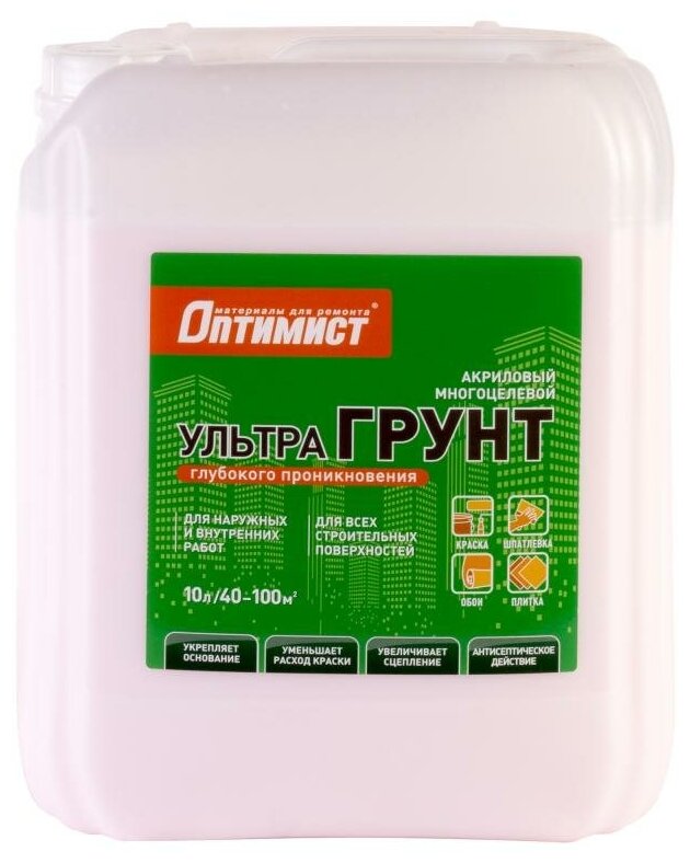 **Грунтовка глубокого проникновения Оптимист** предназначена для укрепления рыхлых оснований, склонных к осыпанию. Материал визуально выглядит, как жидкость на водной основе с включениями полимеров. В состав также включены антибактериальные компоненты, препятствующаие образование грибка и плесени.