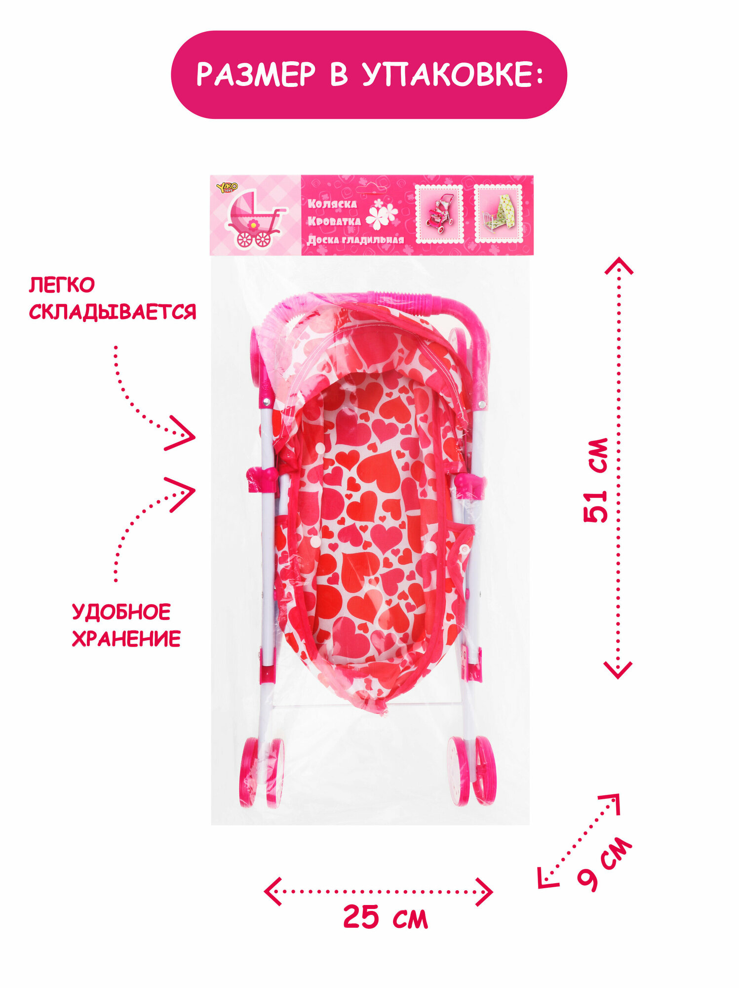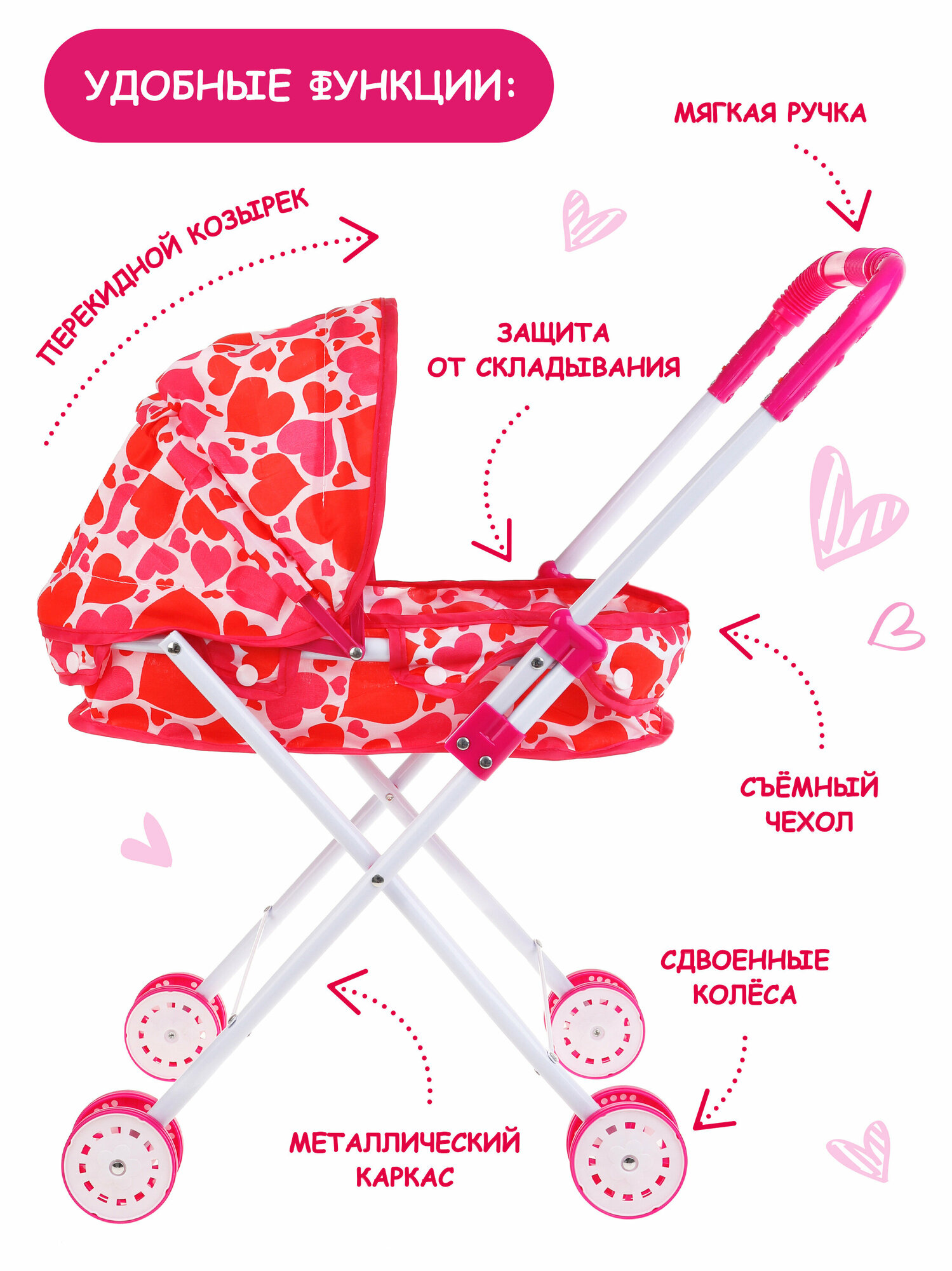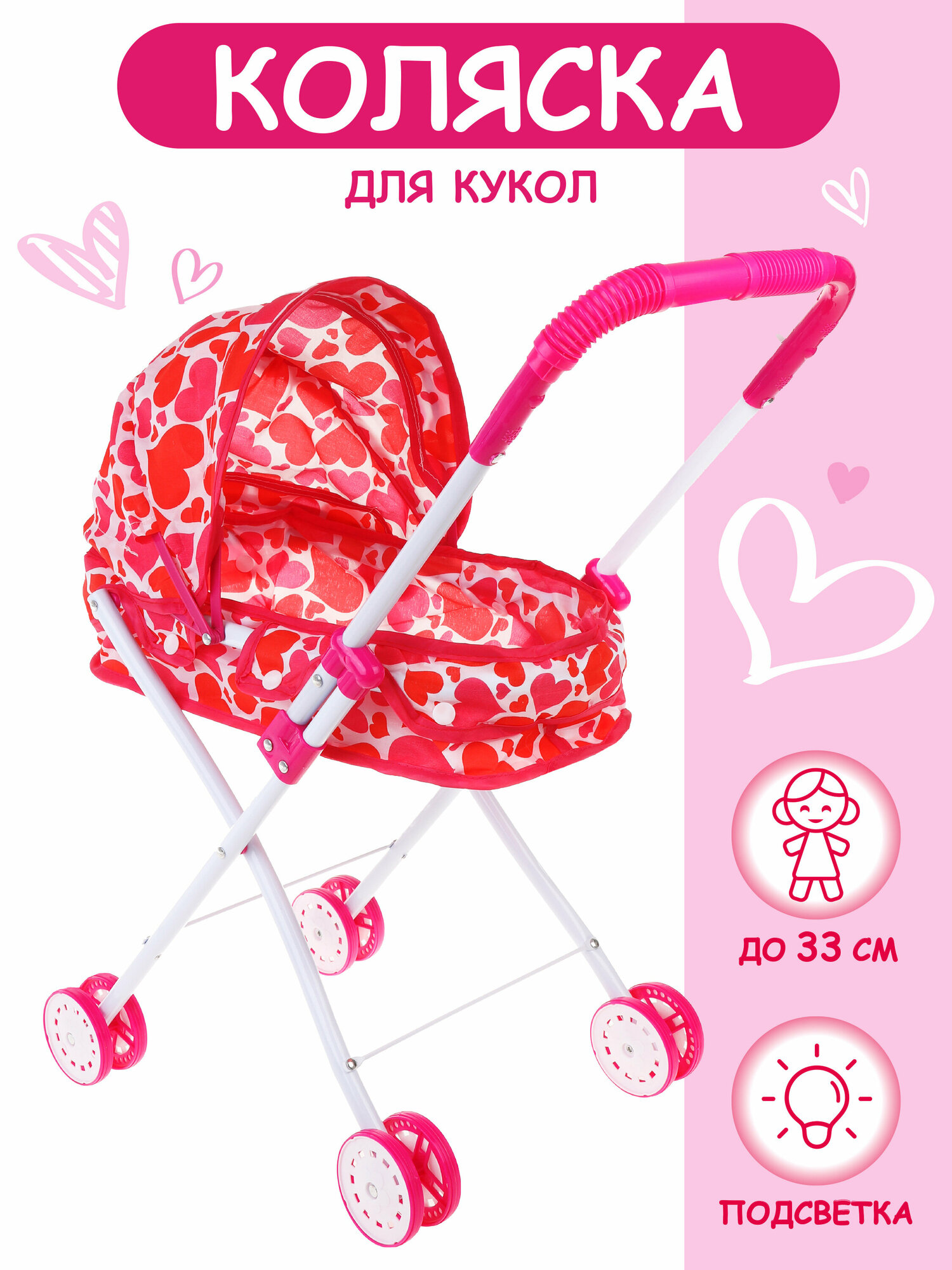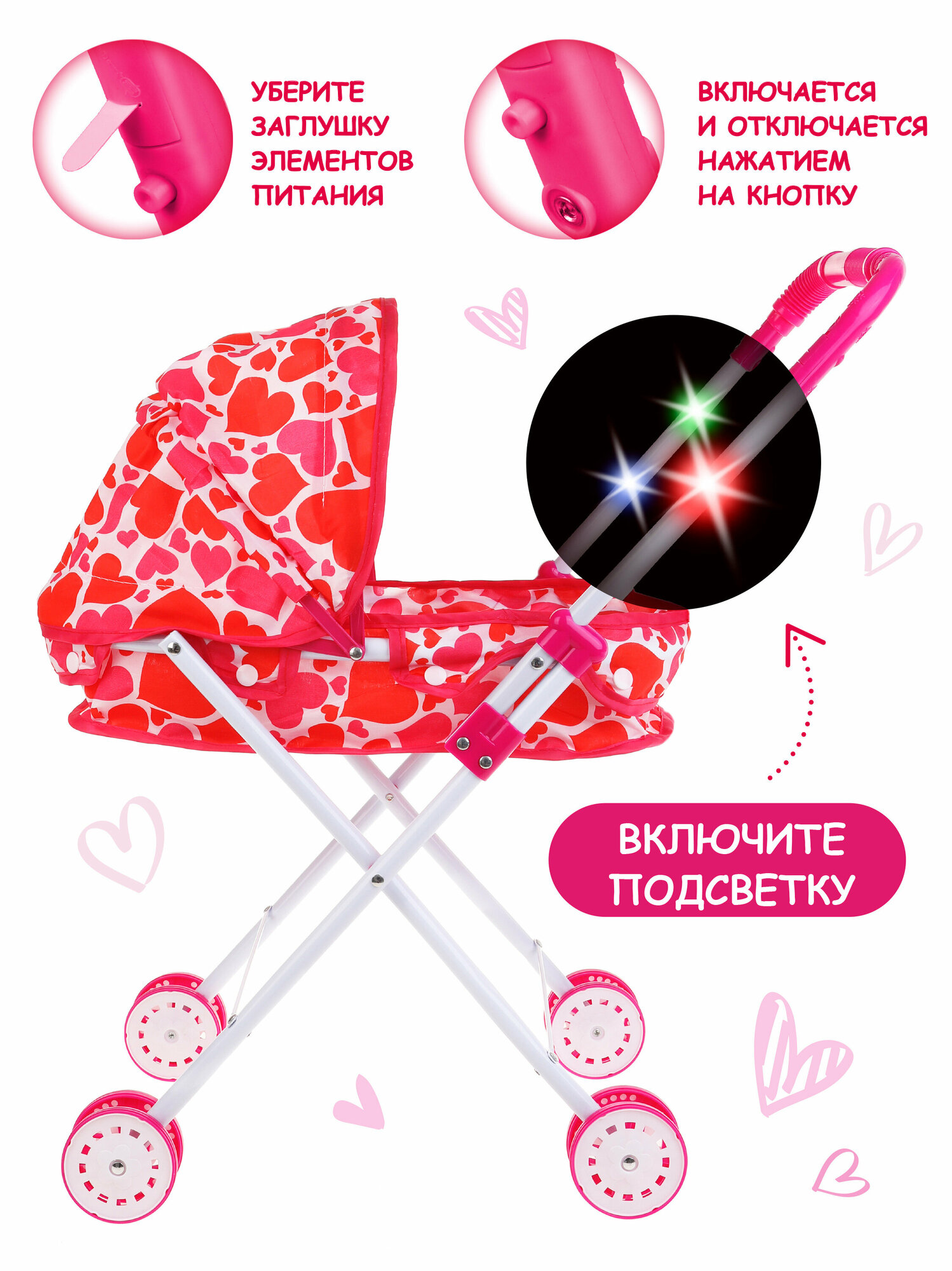 Коляска для куклы Наша Игрушка люлька Сердца светящаяся M1418-5L