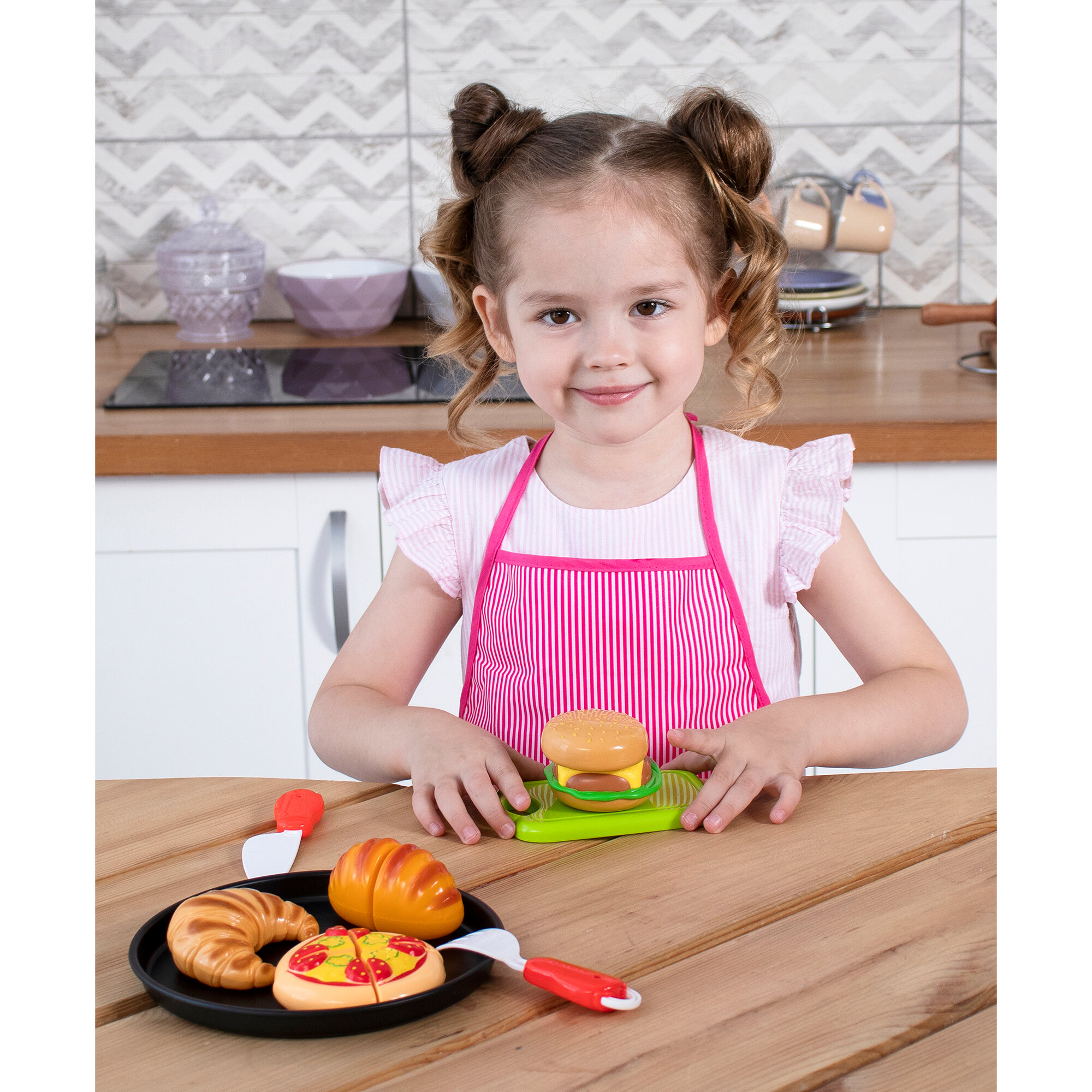 В комплект входят: доска, вилка, ножик, пицца (четыре элемента), гамбургер (два элемента), хлеб (два элемента), круассан (два элемента).