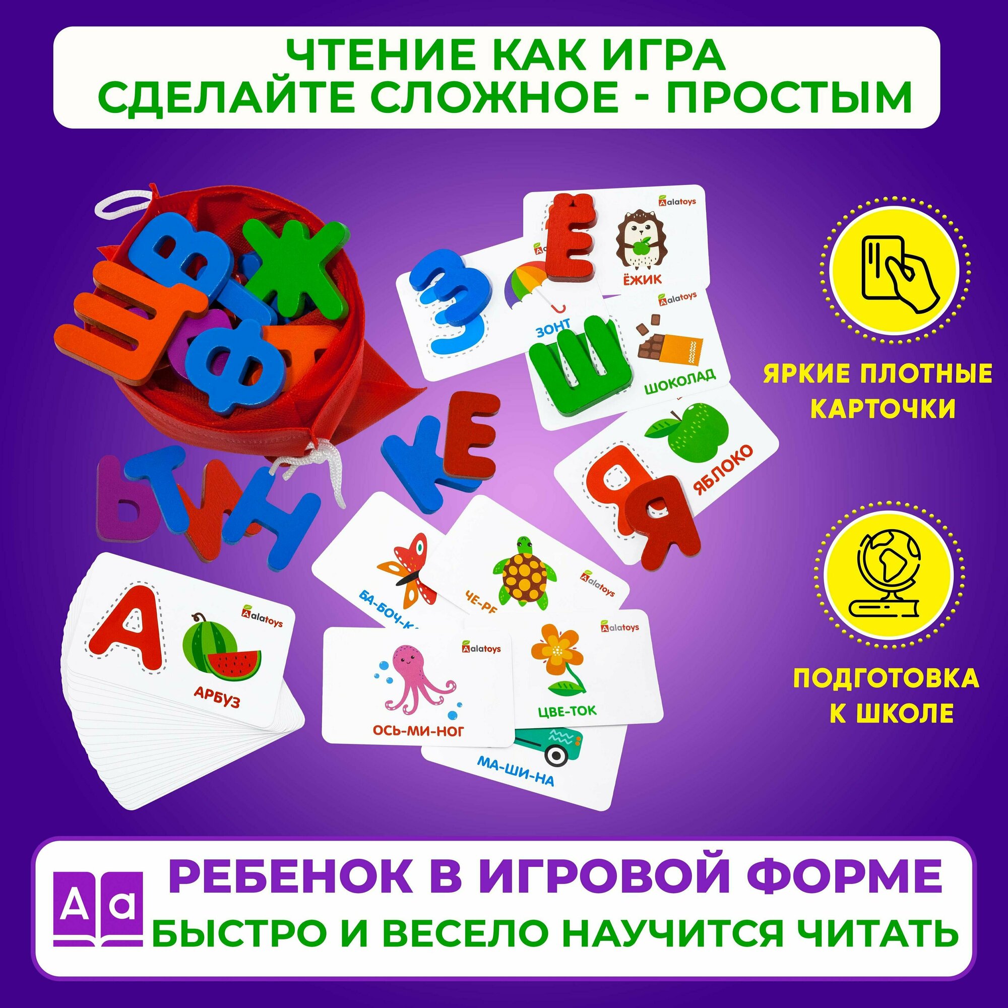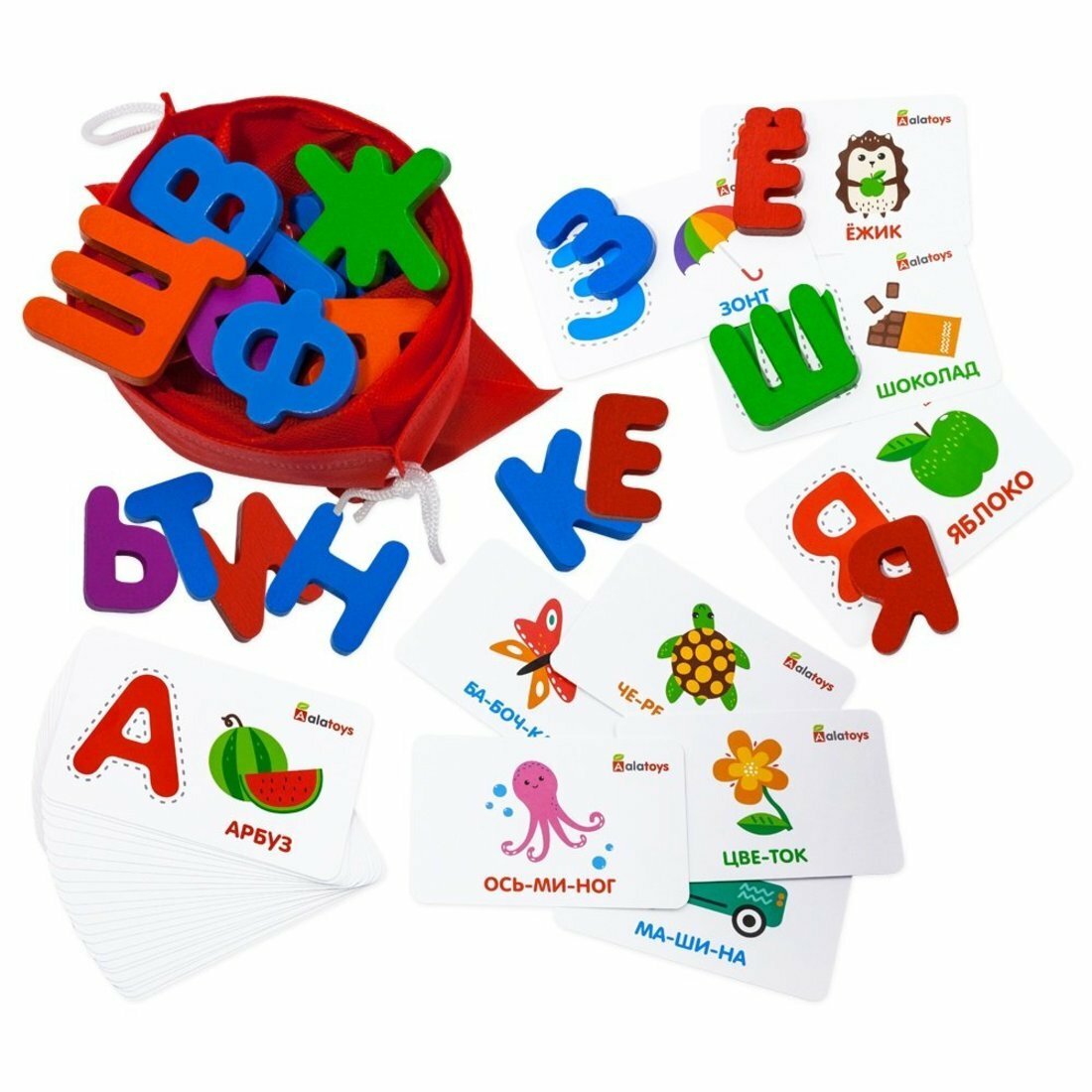 В наборе 33 буквы русского алфавита и 32 двусторонние карточки. Фигурки букв разных цветов в зависимости от характеристики буквы: гласные – красные, согласные твердые – синие, согласные мягкие – зеленые, твердый и мягкий знак – фиолетовые. На одной стороне карточки изображена буква алфавита, картинка и название предмета, которое начинается на эту букву. На другой стороне картинка и слово, разделённое на слоги.