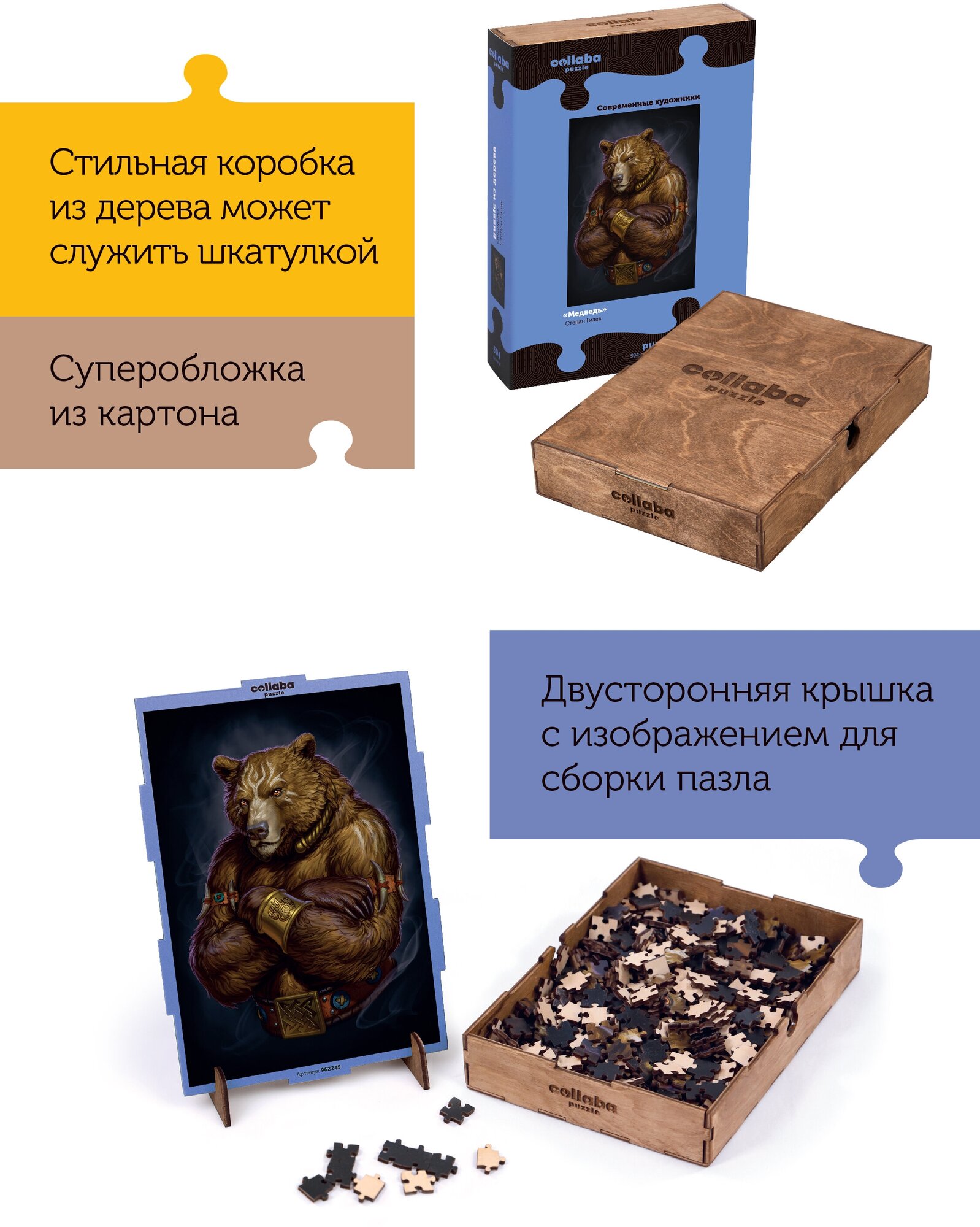 Пазл упакован в стильную коробку-шкатулку из фанеры. Изображение для сборки нанесено на обратную сторону крышки коробки. Также в наборе есть специальная сборная подставка, на которую можно установить крышку с изображением для удобства сборки.