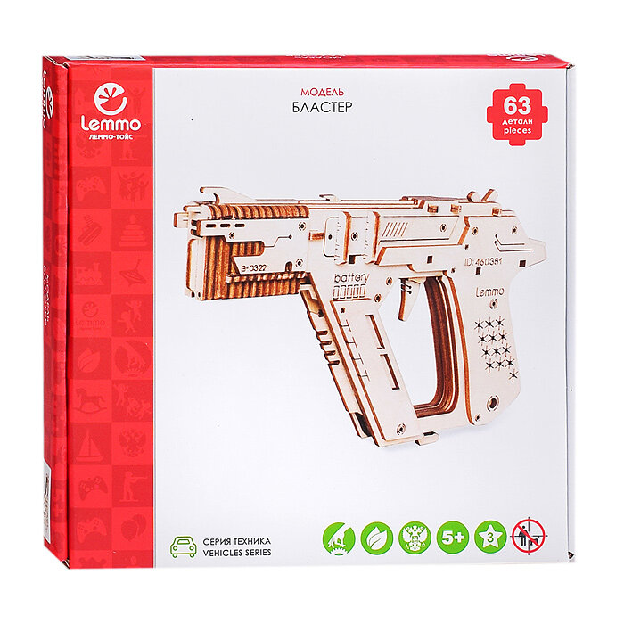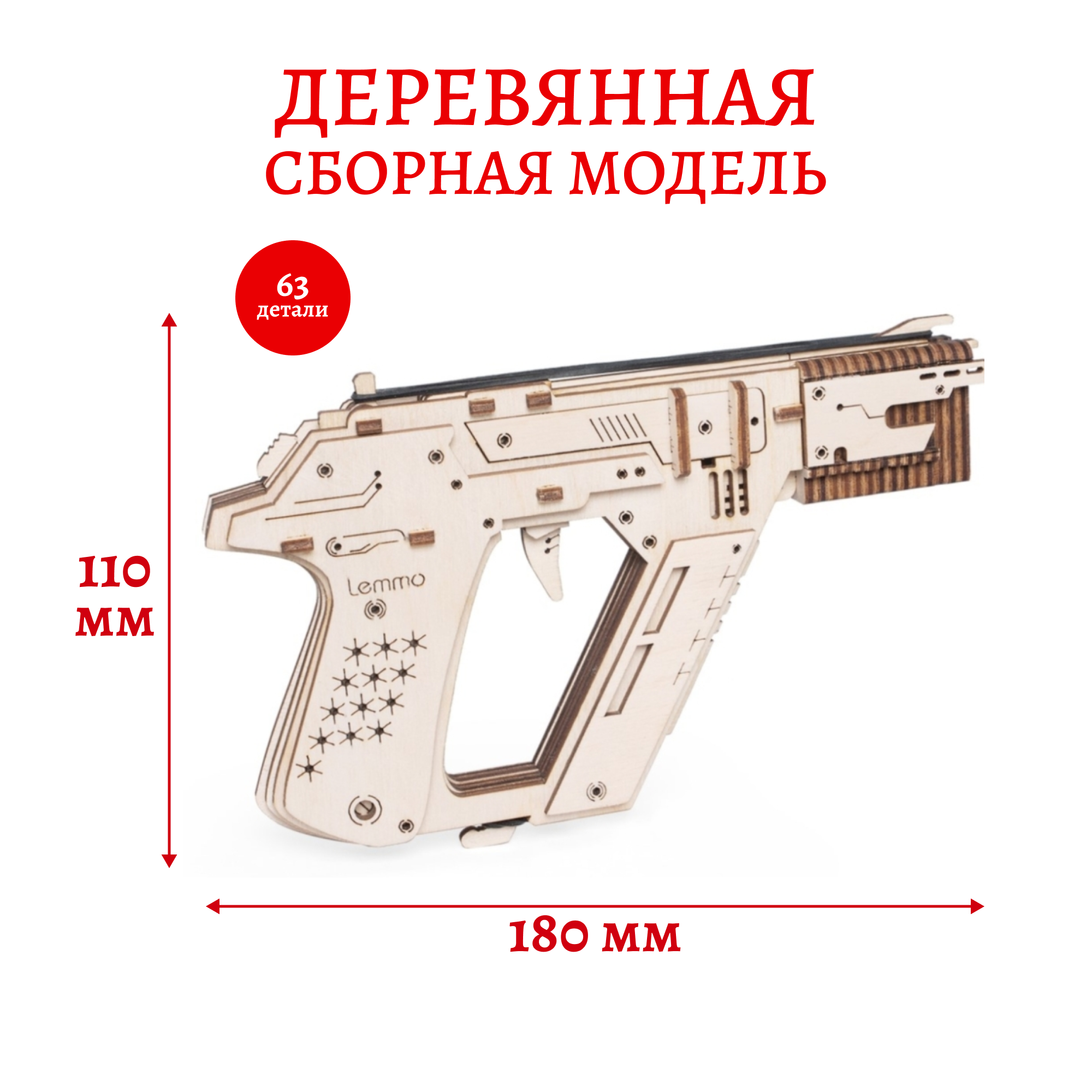 Деревянная игрушка Lemmo Особенности: Детали для сборки пистолета выполнены из березовой фанеры высшего сорта. Собранный деревянный пистолет готов к игре мальчишек, его можно заряжать канцелярскими резинками, которые идут в комплекте, либо их можно докупить в канцтоварах. Конструкторы Леммо разработали пистолет специально под размер детской руки, чтобы было удобно держать и стрелять. Одной из особенностей модели является свободный доступ к внутреннему механизму, где можно заменить резинку-натяжитель. Это повышает надежность и модели и пистолет можно использовать не один год. Габаритные размеры: 180 х 25 х 110 мм. Кол-во деталей: 63.