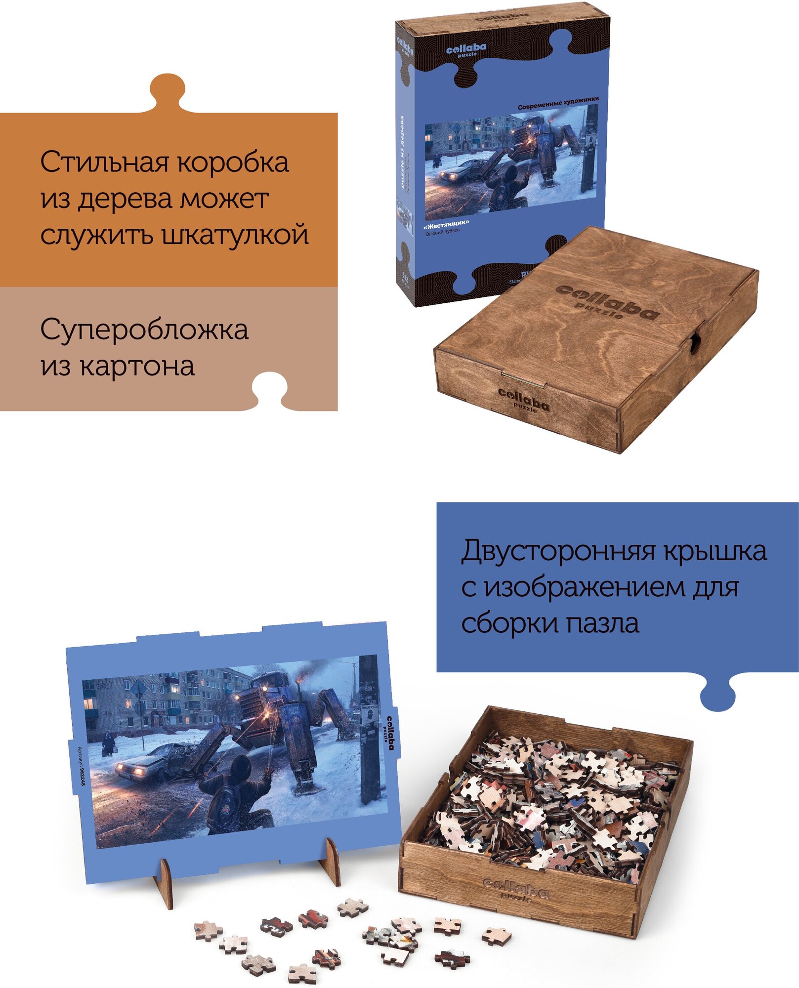 Пазл упакован в стильную коробку-шкатулку из фанеры. Изображение для сборки нанесено на обратную сторону крышки коробки. Также в наборе есть специальная сборная подставка, на которую можно установить крышку с