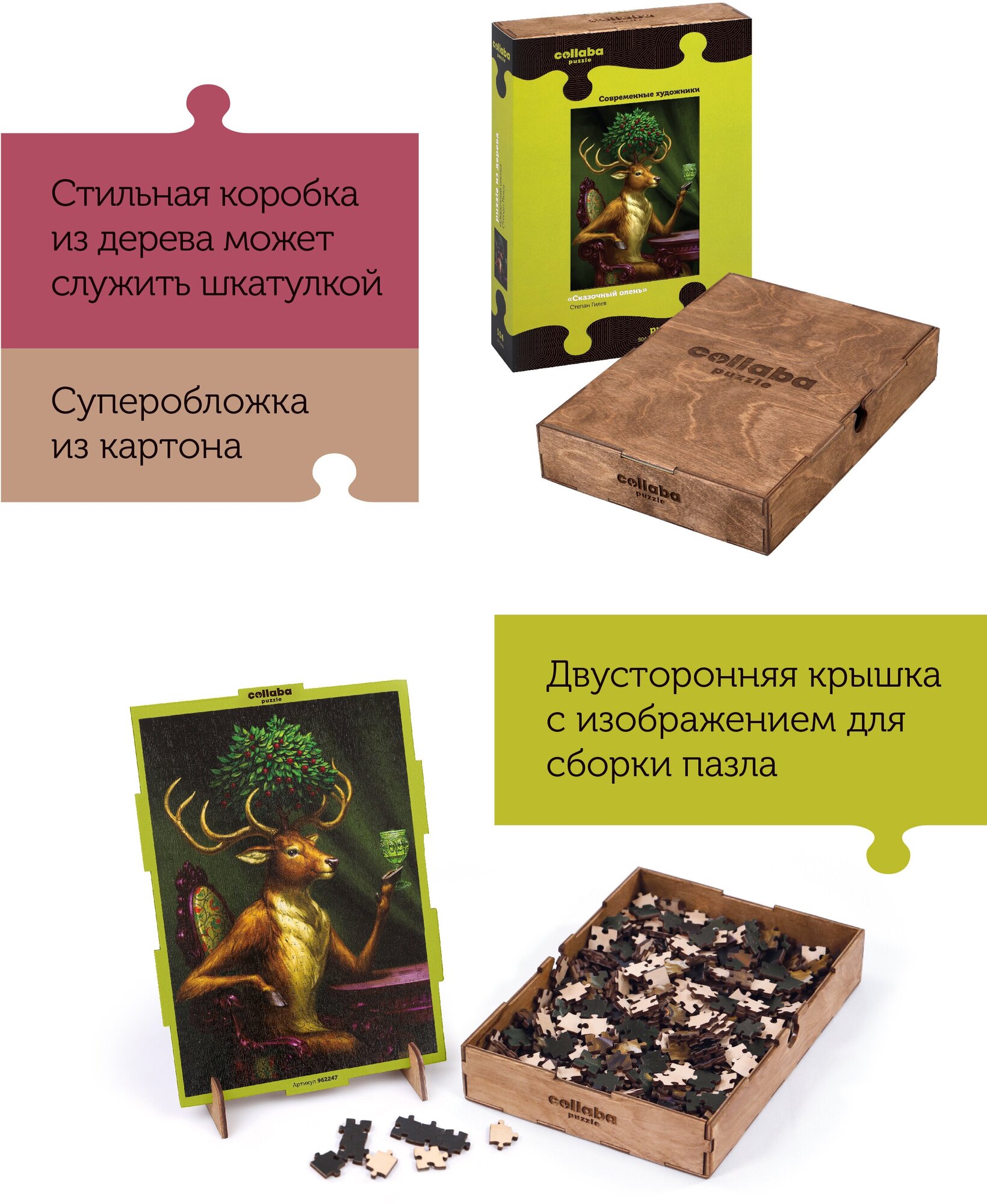 Пазл упакован в стильную коробку-шкатулку из фанеры. Изображение для сборки нанесено на обратную сторону крышки коробки. Также в наборе есть специальная сборная подставка, на которую можно установить крышку с изображением для удобства сборки. Собранный пазл, при желании, можно склеить, поместить в рамку и повесить на стену (основа для склеивания и рамка не входят в комплект). Деревянный пазл станет универсальным подарком на любой праздник!