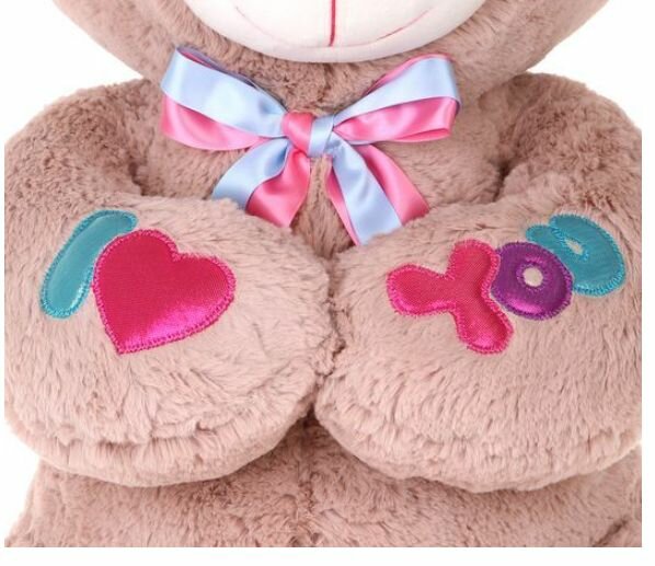 На передних лапках у мишки есть нашивки, изображающие сердечко с надписью I love you, на одной из нижних лапок — нашивки в виде трёх сердечек разных цветов. Шея медвежонка украшена крупным атласным бантом, который придаёт всему образу медведя романтичности и очарования.