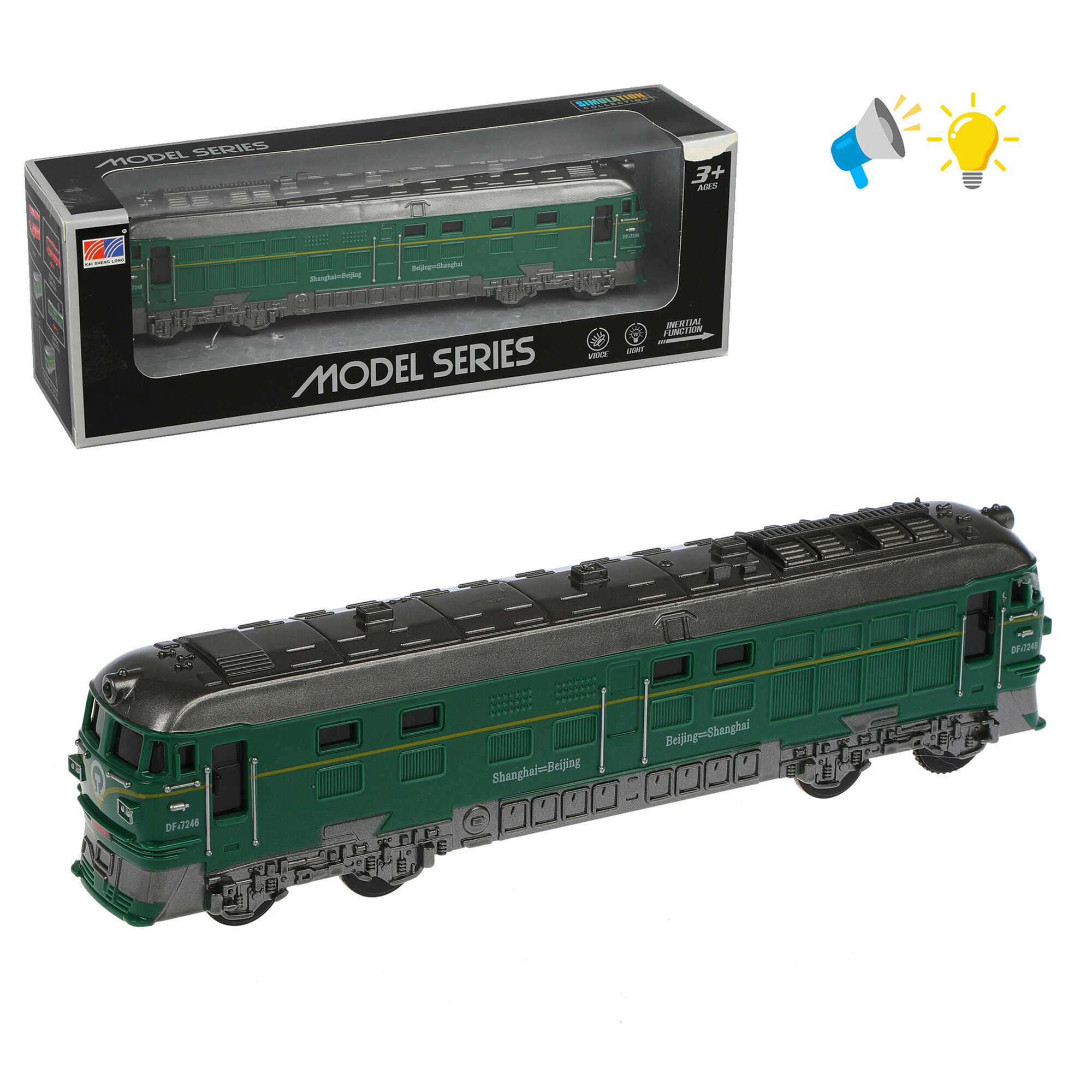 Стоит разогнать паровозик об асфальт или пол, как он шустро помчится вперёд! А при нажатии кнопки на дне игрушки активируются светозвуковые функции: звук мчащегося поезда и мерцающий свет фонаря.