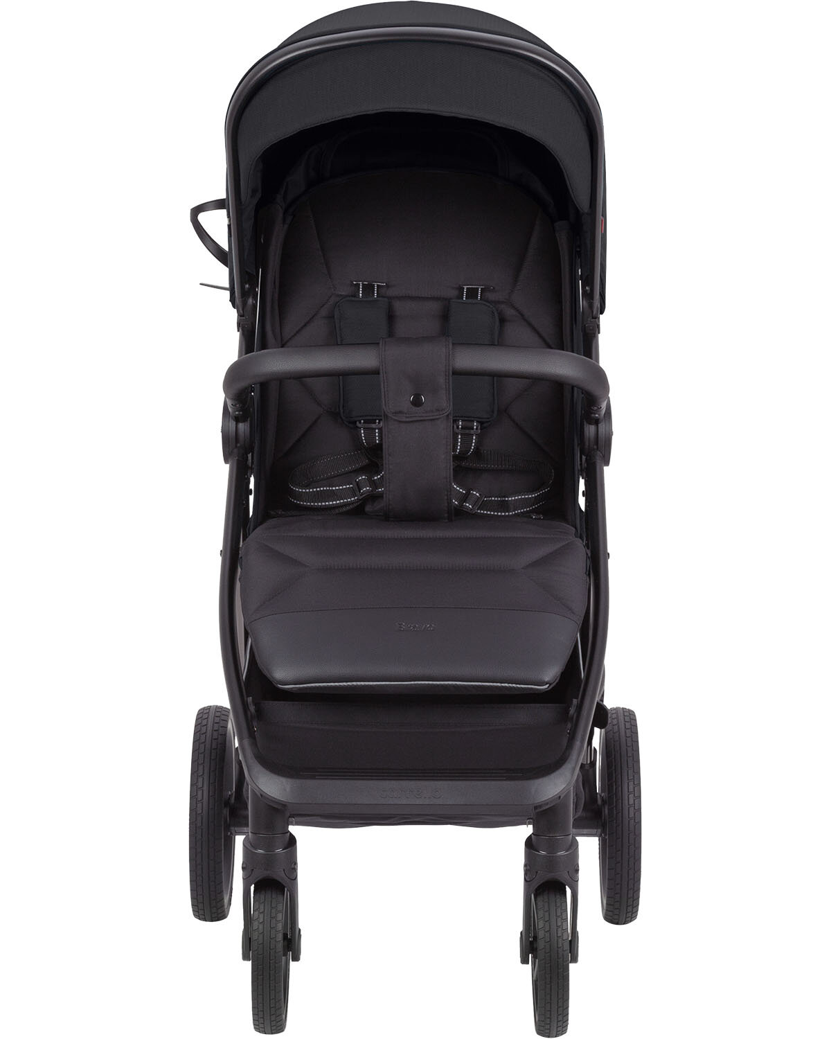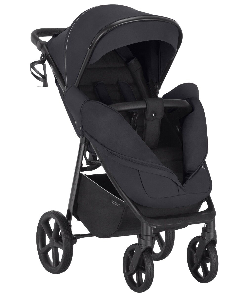 Прочная алюминиевая рама со стойким комбинированным покрытием (polymerization Total Black + Black Hrom) порадует не только надёжностью и эргономикой, но и презентабельным, элегантным дизайном, и регулируемой в четырех положениях родительской ручкой, обтянутой эко-кожей премиум класса. Поворотный съёмный бампер также обтянут эко-кожей.