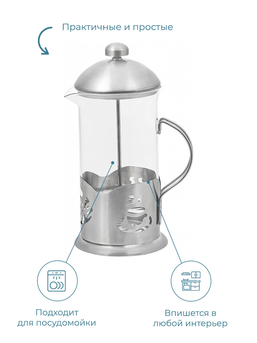 Френч-пресс отлично вписывается в деловой и домашний интерьер, незаменим для повседневного или праздничного чаепития, красивого заваривания и подачи кофе.