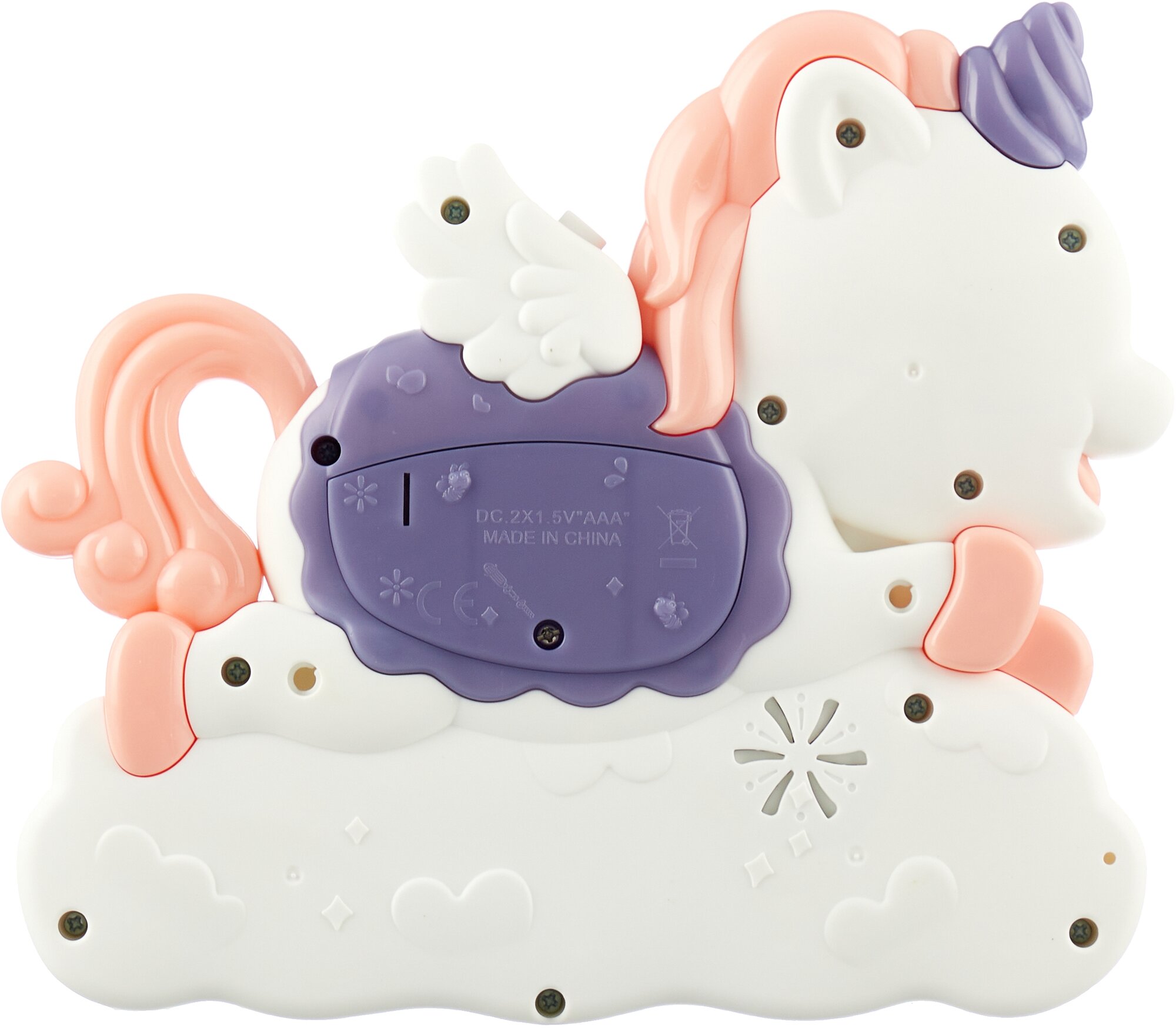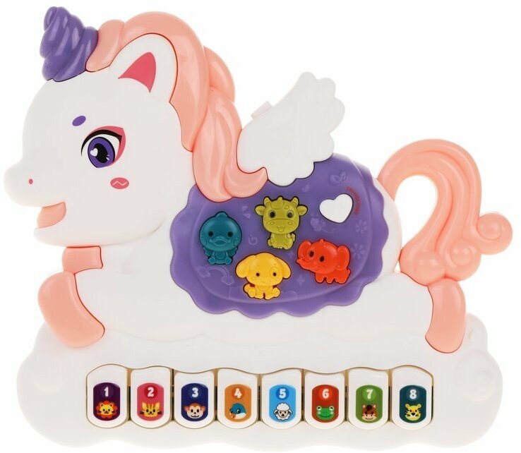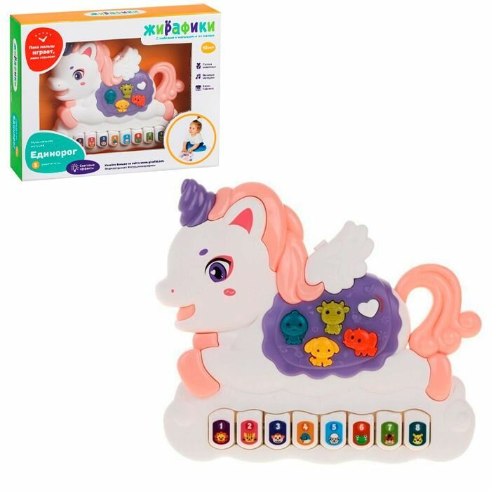 Музыкальная игрушка «Единорог» работает в 3-х режимах. Малыш послушает веселые мелодии, забавные голоса животных и звуки пианино. Режимы переключаются нажатием кнопки в виде сердечка. Во время игры рог сказочного персонажа красиво светится.