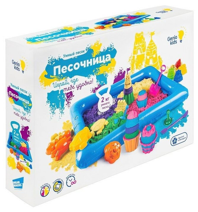 Процесс лепки с умным песком от Genio Kids - настоящее удовольствие для тех, кто любит строить и творить своими руками что-то новенькое и необычное. Теперь вы можете порадовать ваше юное дарование целыми 2 кг умного песка разных цветов, да еще и с надувной песочницей. Теперь не стоит переживать про загрязнения или какие-то неудобства в процессе игры с этим необычным материалом.