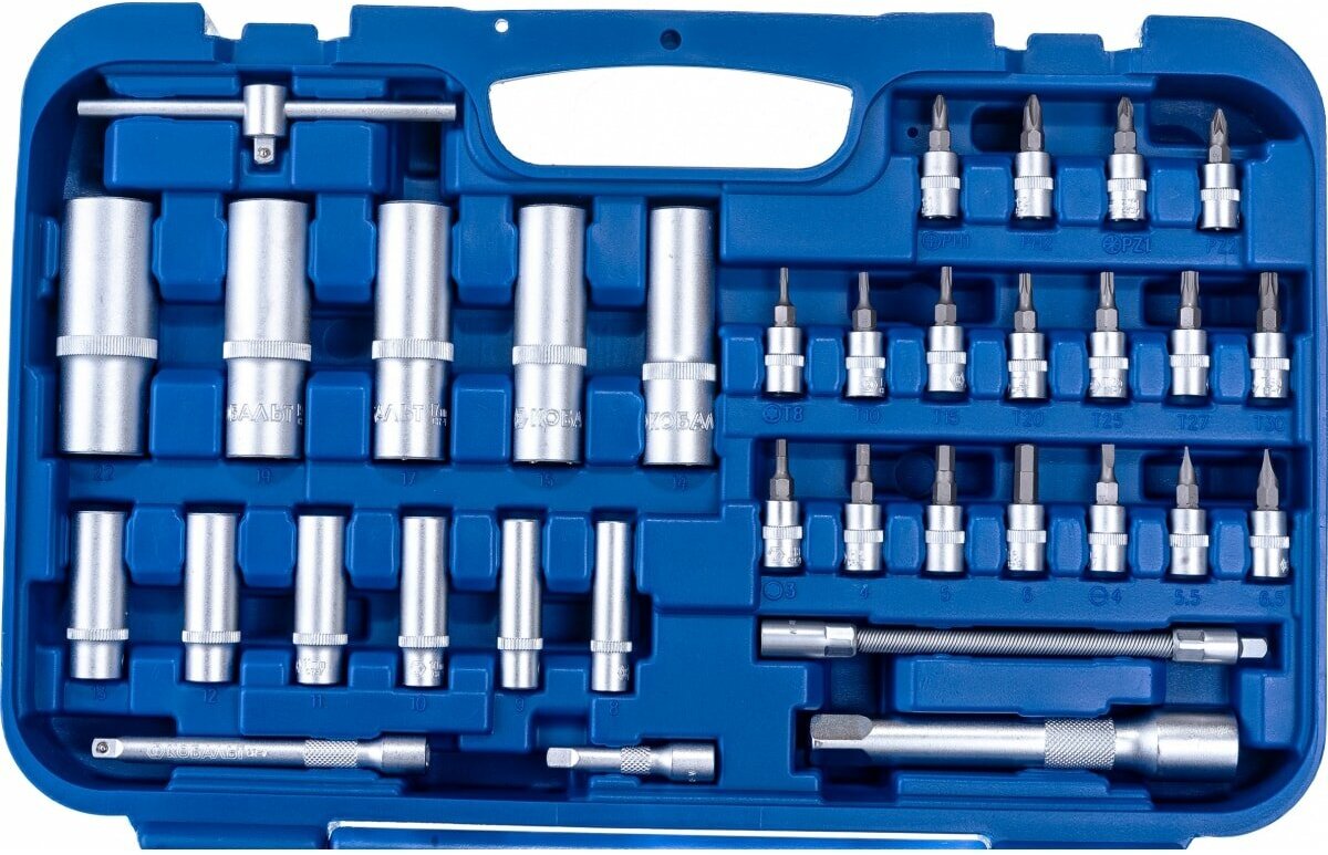 100 предметов: Головки 1/4" 18шт: 4, 4.5, 5, 5.5, 6, 7, 8, 9, 10, 11, 12, 13, глубокие 8, 9, 10, 11, 12, 13мм;Головки с вставками 1/4" 18шт: Ph1, Ph2, Pz1, Pz2, T8, T10, T15, T20, T25, T27, T30, H3, H4, H5, H6, SL4, SL5.5, SL6.5;Набор бит 1/4" 32 шт: Ph0, Ph1, Ph2, Ph3, PH4, Pz0, Pz1, Pz2, Pz3, Pz4, T8, T9, T10, T15, T20, T25, T27, T30, H1.5, H2, H2.5, H3, H4, H5, H6, SL3, SL4, SL4.5, SL5, SL5.5, SL6, SL7;Приводы 1/4": удлинители 3шт - 50, 100мм, гибкий 150мм, вороток T-образный 115мм, трещоточная рукоятка 72 зуба с углом поворота 5о, карданный шарнир, отверточная рукоятка, адаптер для бит квадрат/шестигранник 1/4";Головки 1/2" 19шт: 14, 15, 16, 17, 18, 19, 21, 22, 24, 27, 30, 32, глубокие 14, 15, 17, 19, 22, свечные 16, 21мм;Приводы 1/2": удлинители 2шт - 125, 250мм, трещоточная рукоятка 45 зубьев с углом поворота 8о, карданный шарнир, переходник;Пластиковый кейс.
