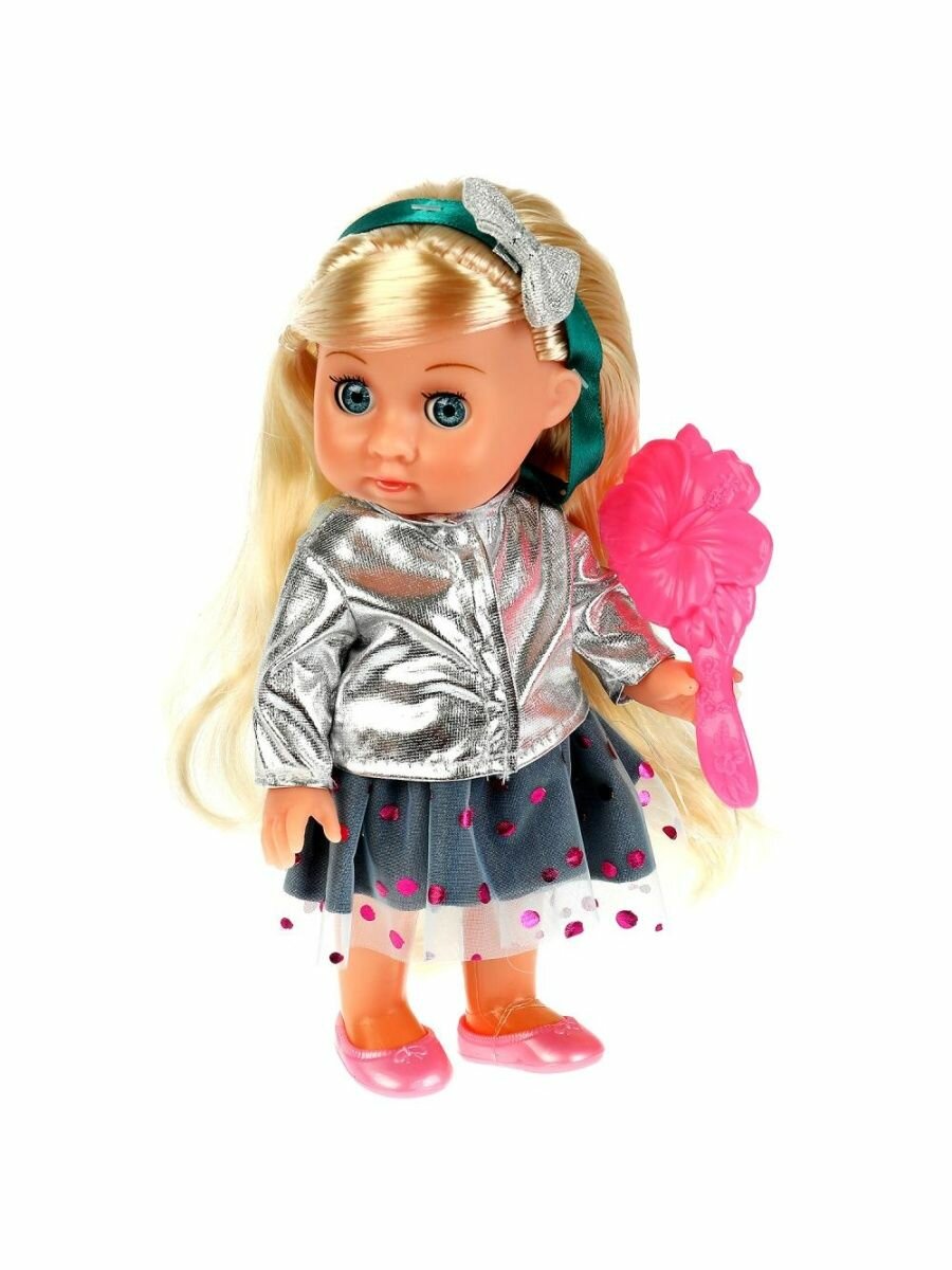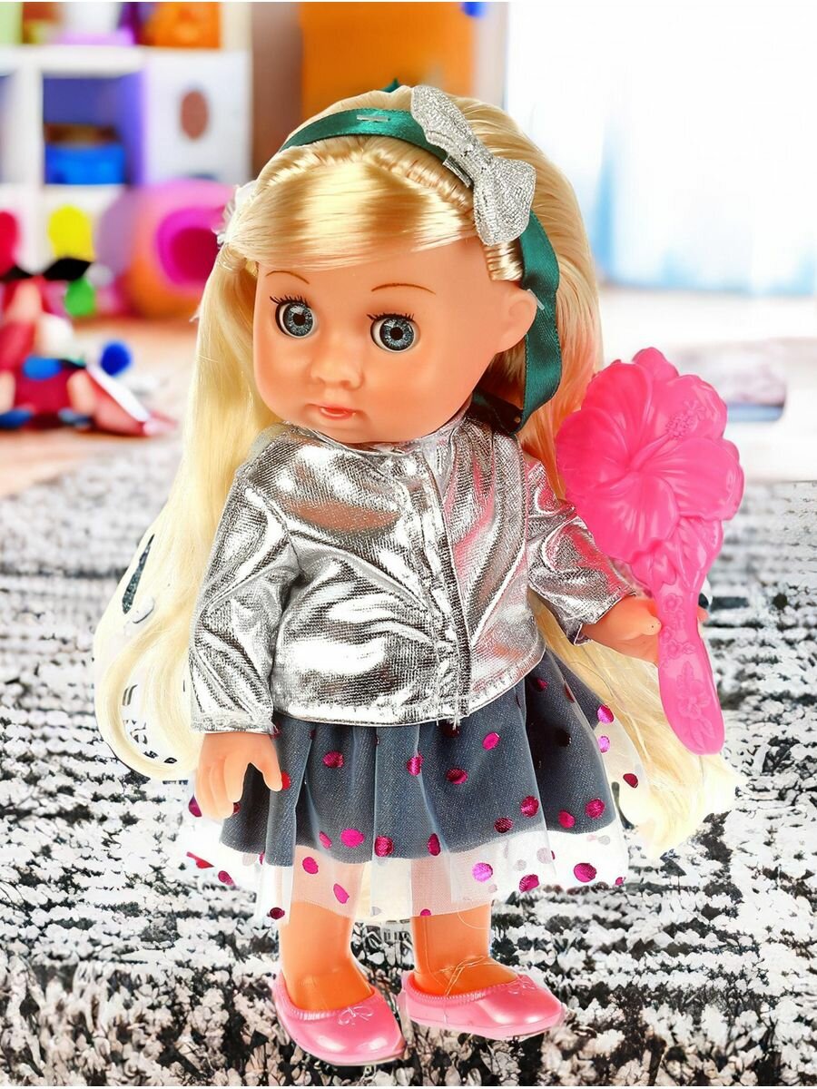 Милая кукла с детально проработанным личиком обязательно понравится малышке. Олеся одета в серебряную курточку и пышную юбку из фатина. Одежда легко снимается и надевается. У куклы длинные красивые волосы. Хозяйка куколки легко сможет сделать Олесе причёску по своему желанию, для этого в наборе имеется расчёска.