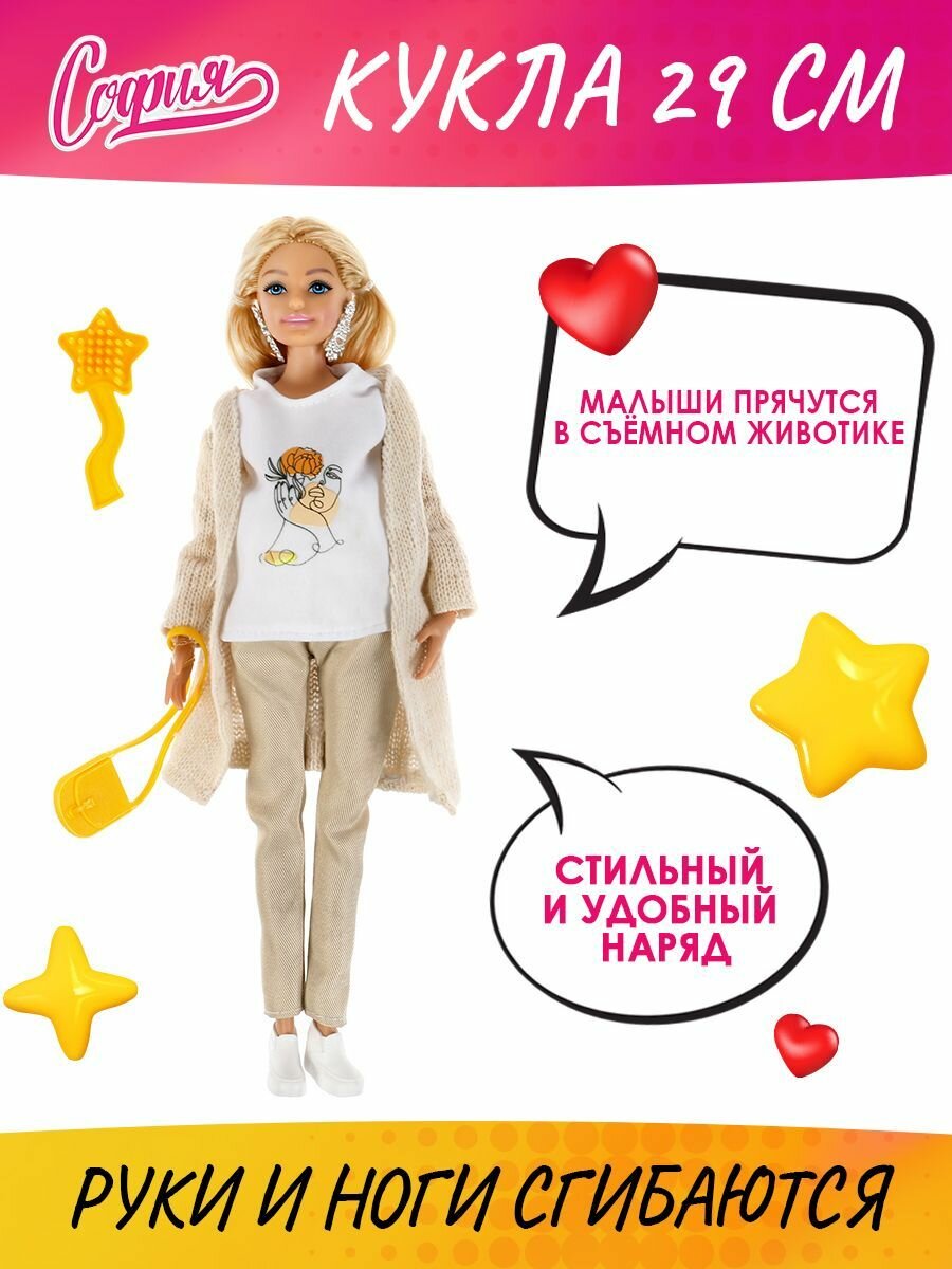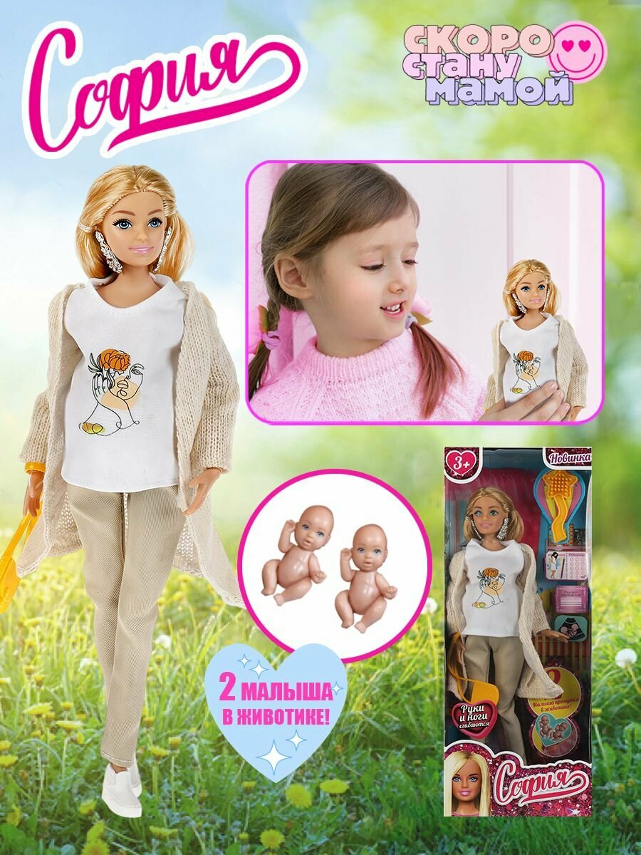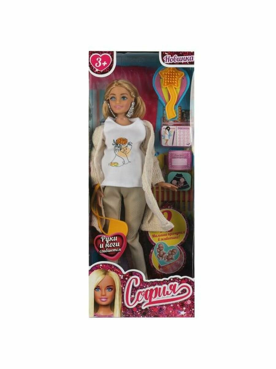 Будущая мама София одета в белую блузу с интересным принтом, светло-бежевые брюки и светлый кардиган. Образ куколки дополняют модные крупные серьги и элегантная сумочка. Одежду и аксессуары легко снять и надеть. С такой модной куклой девочке будет интересно и весело играть: благодаря тому, что руки и ноги куклы подвижны, им можно придать любое положение. У Софии длинные красивые волосы, которые хозяйка куклы сможет заплетать в разные причёски. Детально проработанный дизайн игрушки вдохновит девочку на новые игровые сюжеты.