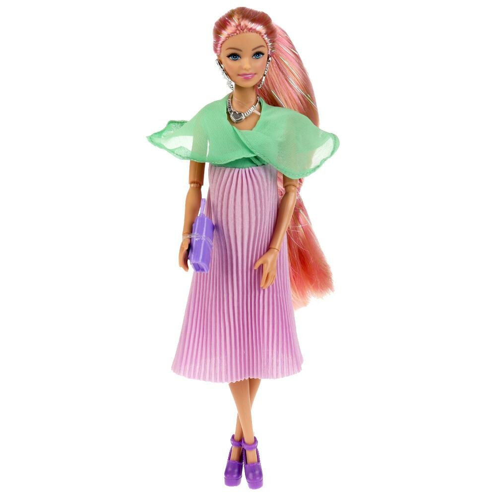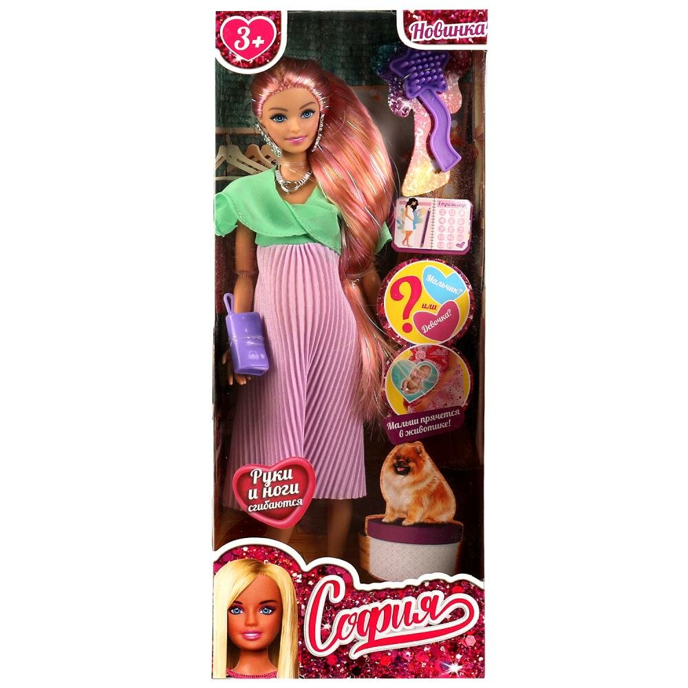 Будущая мама София одета в женственное платье с юбкой-плиссе. Образ куколки дополняют модные крупные серьги, колье и элегантная сумочка. Одежду и аксессуары легко снять и надеть. С такой модной куклой девочке будет интересно и весело играть: благодаря тому, что руки и ноги куклы подвижны, им можно придать любое положение. У Софии длинные красивые волосы, которые хозяйка куклы сможет заплетать в разные причёски. Детально проработанный дизайн игрушки вдохновит девочку на новые игровые сюжеты.