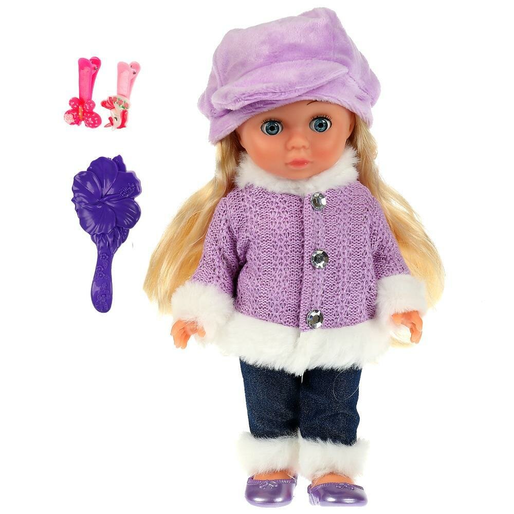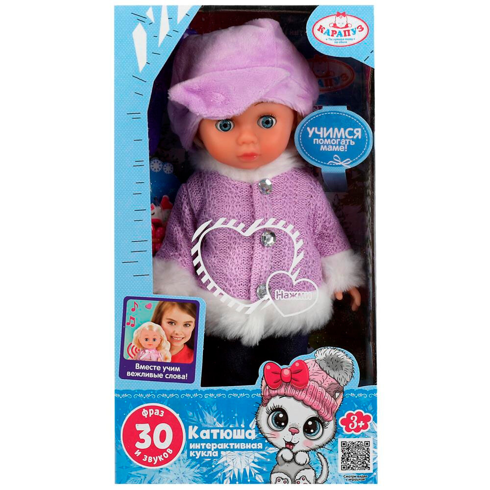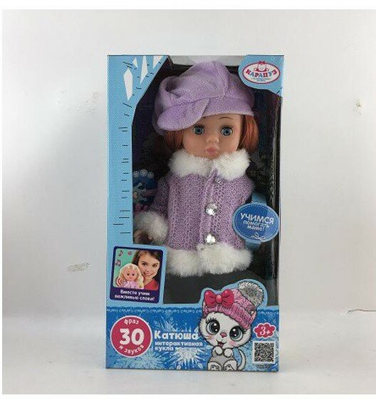 Милая кукла с детально проработанным личиком обязательно понравится малышке. Катюша одета в фиолетовую кофточку с белой меховой оторочкой и шапочку в тон. Одежда легко снимается и надевается. У куклы длинные красивые волосы, которые можно расчёсывать и укладывать в разные причёски.