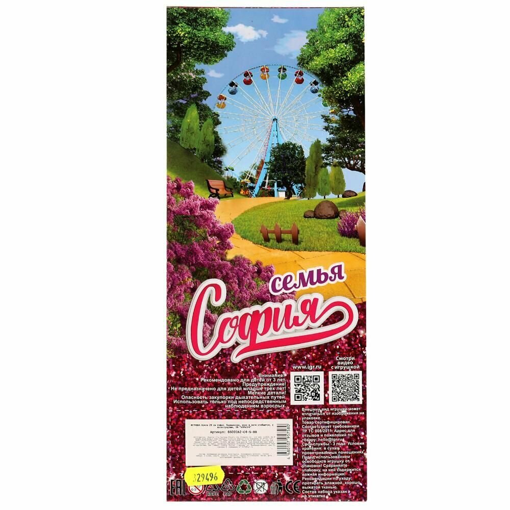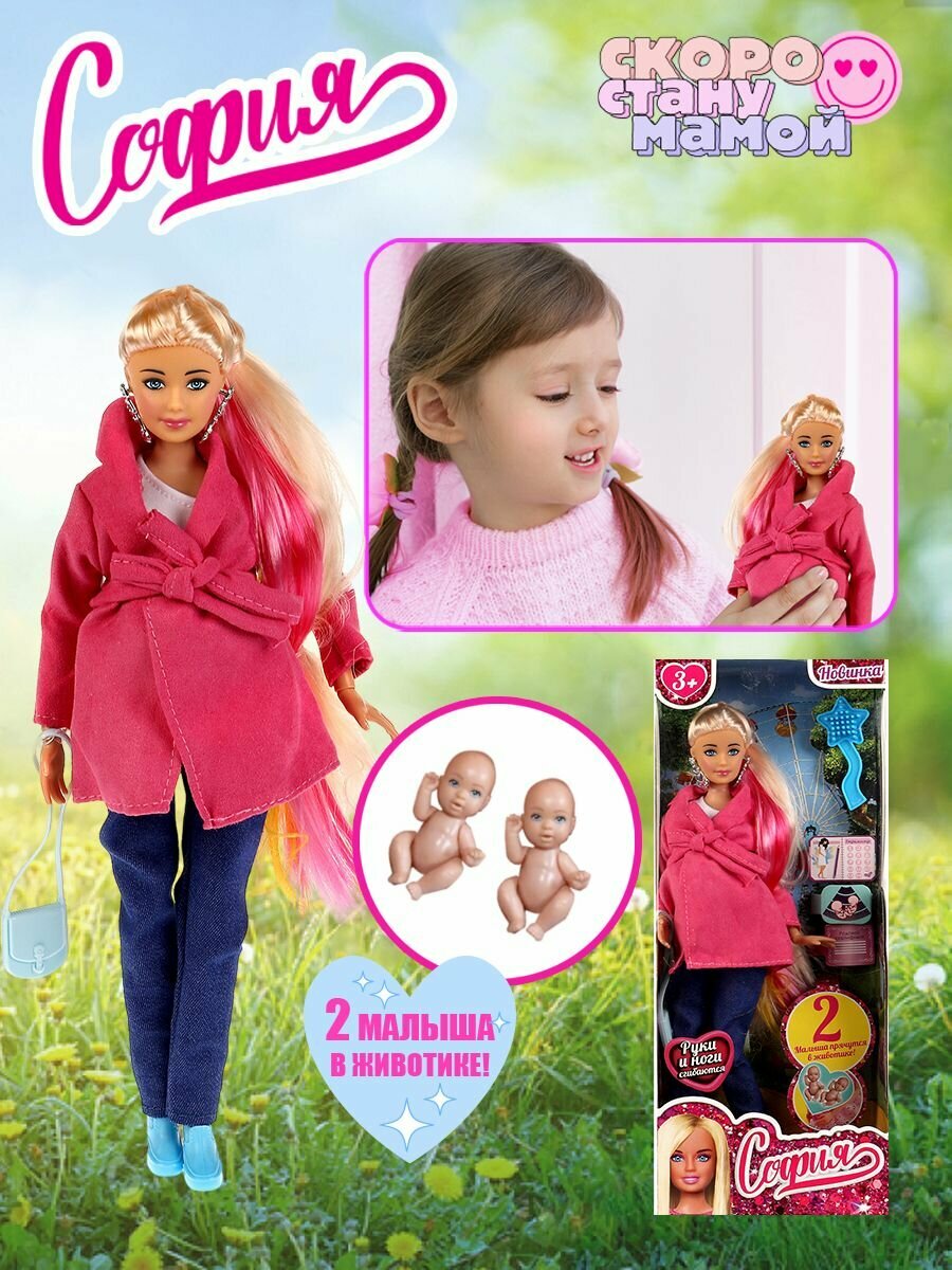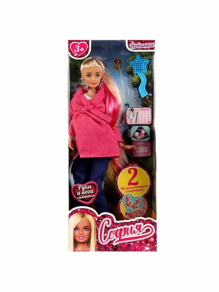 Будущая мама София одета в светлую кофточку, практичные брюки и яркое розовое пальто. Образ куколки дополняют модные крупные серьги и элегантная сумочка. Одежду и аксессуары легко снять и надеть. С такой модной куклой девочке будет интересно и весело играть: благодаря тому, что руки и ноги куклы подвижны, им можно придать любое положение. У Софии длинные красивые волосы, которые хозяйка куклы сможет заплетать в разные причёски. Детально проработанный дизайн игрушки вдохновит девочку на новые игровые сюжеты.
