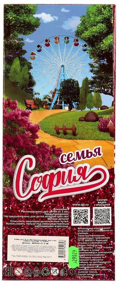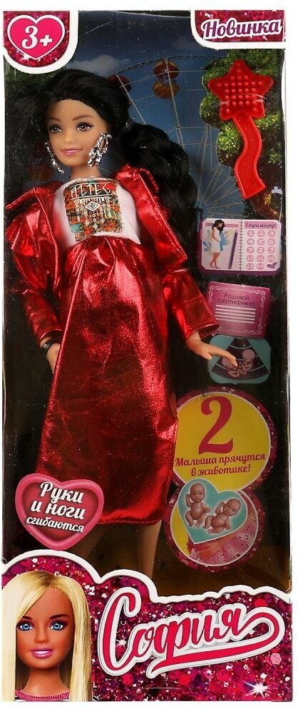 Будущая мама София одета в яркий блестящий наряд. Образ куколки дополняют модные крупные серьги и элегантная сумочка. Одежду и аксессуары легко снять и надеть. С такой модной куклой девочке будет интересно и весело играть: благодаря тому, что руки и ноги куклы подвижны, им можно придать любое положение. У Софии длинные красивые волосы, которые хозяйка куклы сможет заплетать в разные причёски. Детально проработанный дизайн игрушки вдохновит девочку на новые игровые сюжеты.