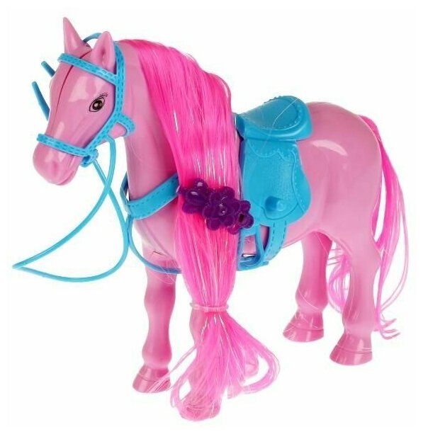 Грациозная лошадка с розовым седлом и сбруей непременно понравится вашей малышке. У лошади гладкая длинная грива и хвост насыщенного розового цвета, которые приятно расчесывать и заплетать. С такой интересной игрушкой девочка сможет отправить любимую куклу на конную прогулку и придумать еще много новых сюжетов для игр.