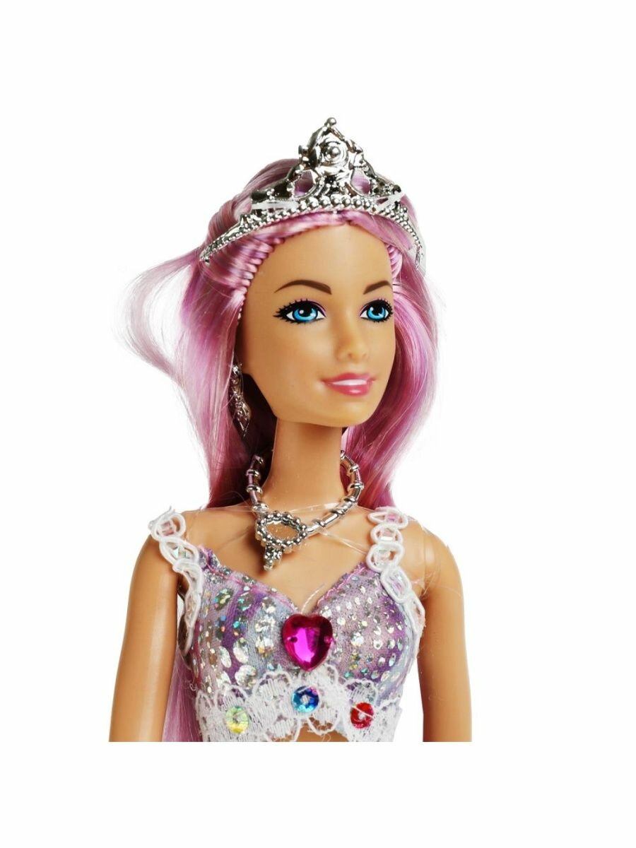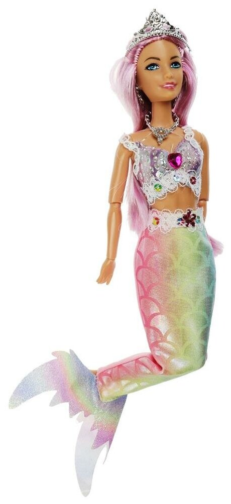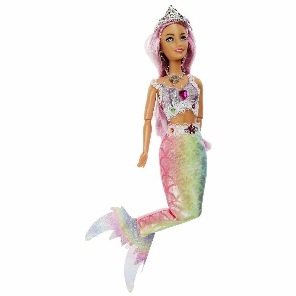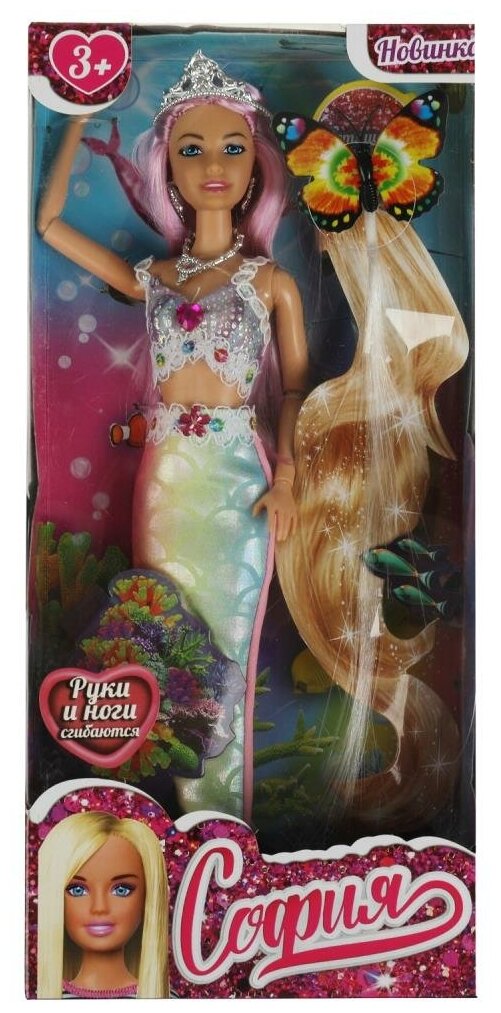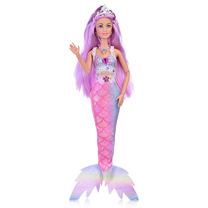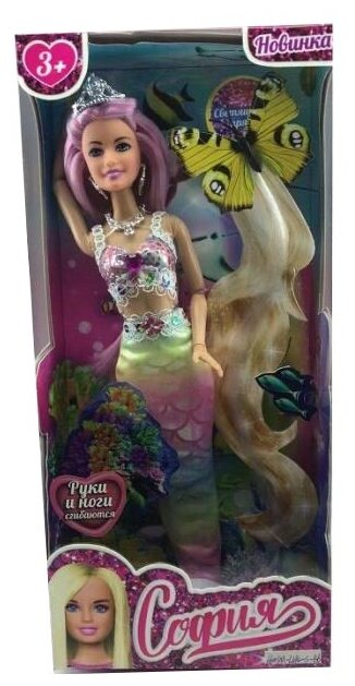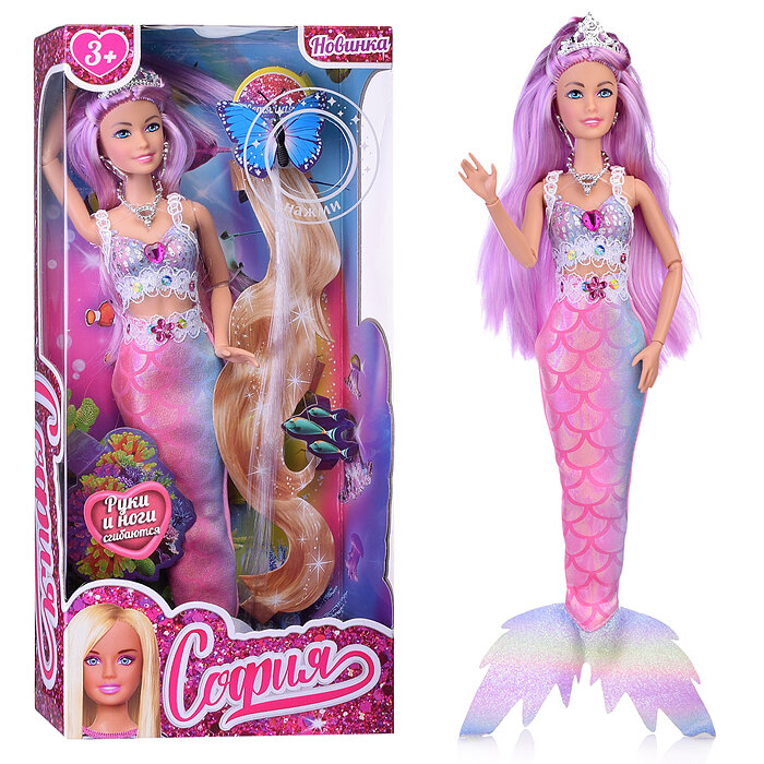 Прекрасная русалка София одета в блестящий топ с кружевом, а также серебристые серьги, колье и корону. Её хвост выполнен из ткани с имитацией чешуи в градиенте пастельных оттенков. Одежду легко снять и надеть. С такой модной куклой девочке будет интересно и весело играть: благодаря тому, что руки и ноги куклы подвижны, им можно придать любое положение. У Софии длинные красивые волосы, которые хозяйка куклы может заплетать в разные причёски. Детально проработанный дизайн игрушки вдохновит девочку на новые игровые сюжеты.