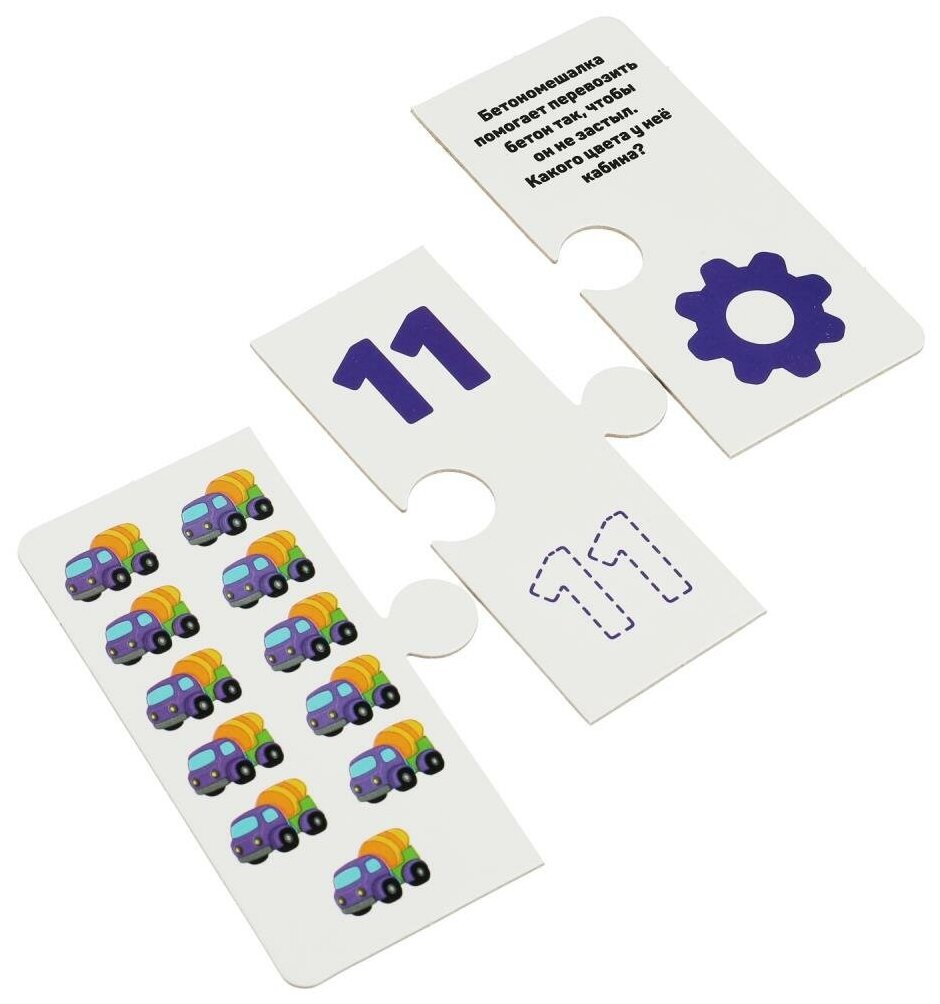 В наборе 11 картинок, каждая из которых разделена на 3 части. Задача ребёнка – подобрать части пазлов так, чтобы собралось изображение той или иной машинки. Благодаря небольшому количеству деталей, малыш без труда сможет выполнить задание, с каждым разом делая это всё лучше и быстрее. Кроме того, на оборотной стороне пазлов содержится информация о цифрах, цветах и формах, поэтому помимо игры в пазлы малыш будет получать полезные знания и знакомиться с окружающим миром.
