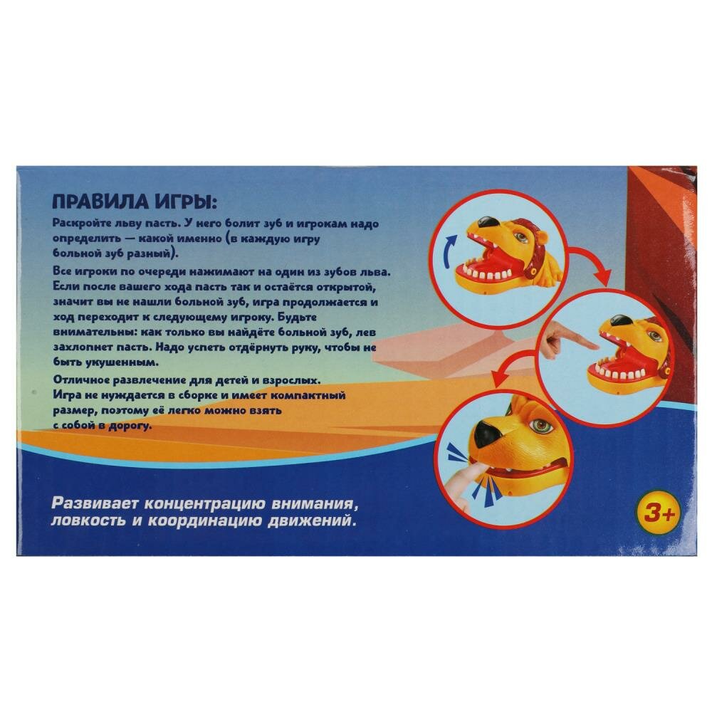 Эта занимательная игра позволит весело и динамично провести время. Цель игры - найти у льва больной зуб, но при этом не дать себя укусить. Фигурка грозного царя зверей с открывающейся и неожиданно захлопывающейся пастью приведёт детей в восторг. Благодаря компактным размерам игру можно брать с собой в поездки.