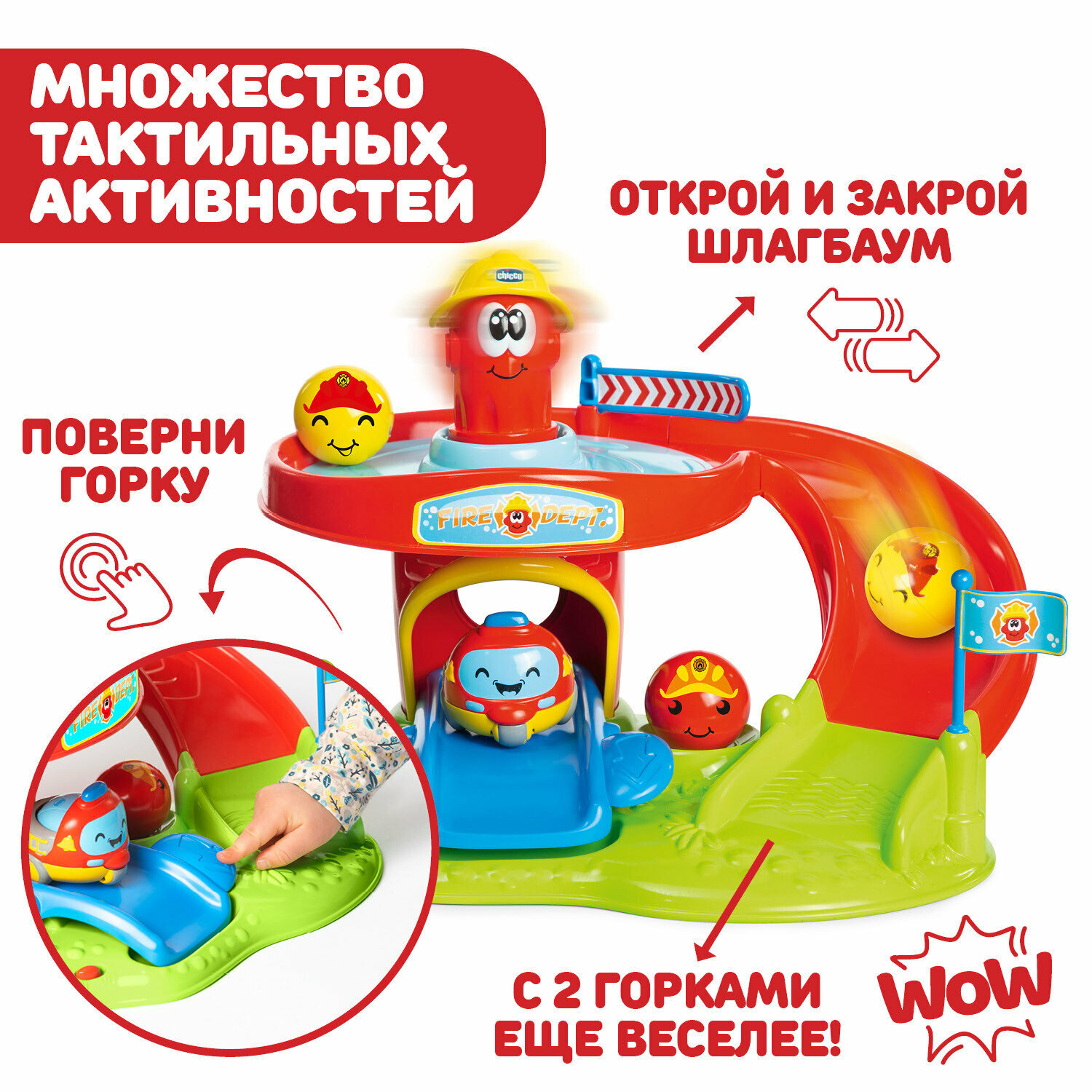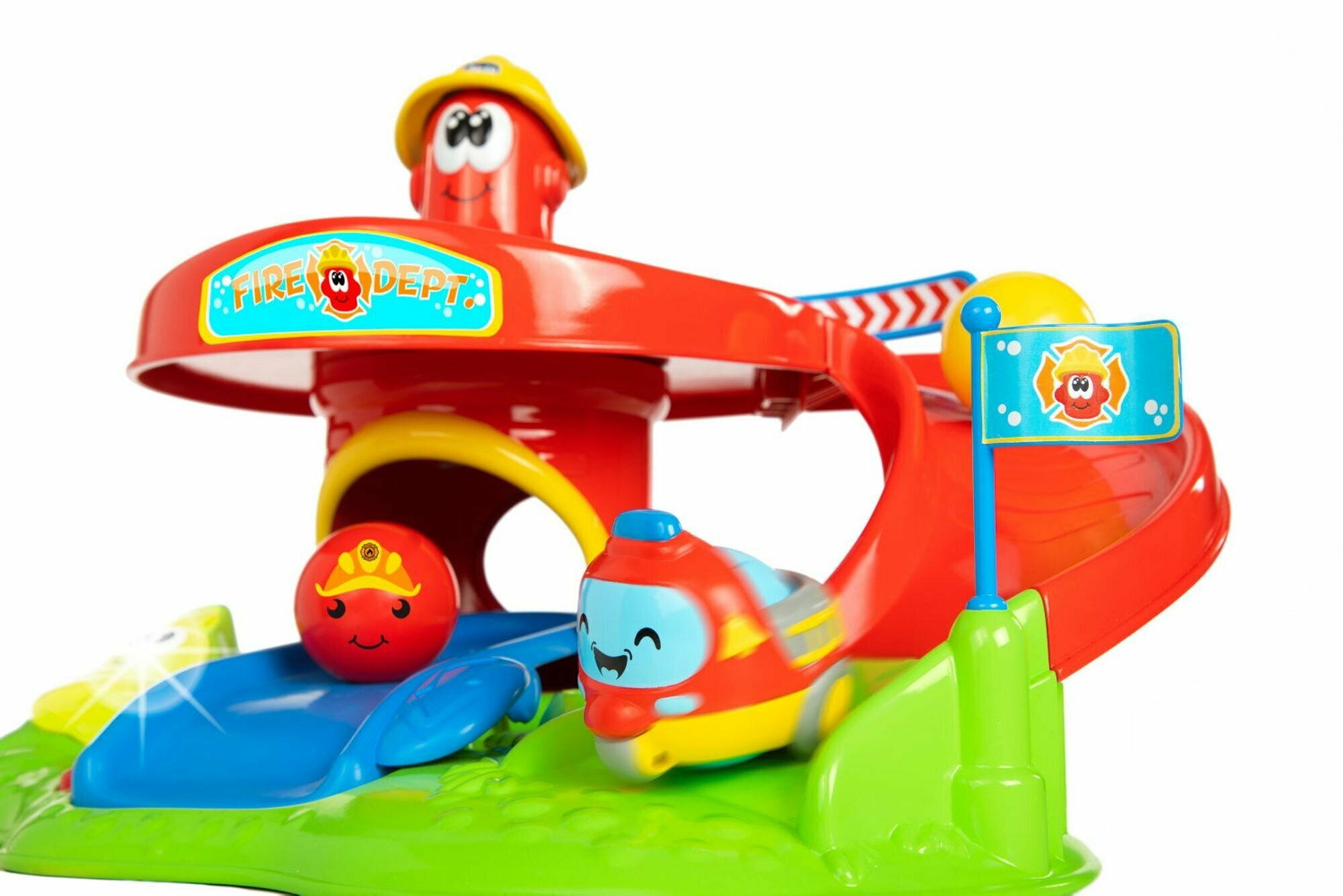 Двухуровневая станция с двумя горками и спиннером: нажми на огнетушитель, чтобы активировать его. При закрытом шлагбауме шарики-пожарные и машинка будут вращаться по кругу, а если его открыть, они весело скатятся вниз по красной горке.