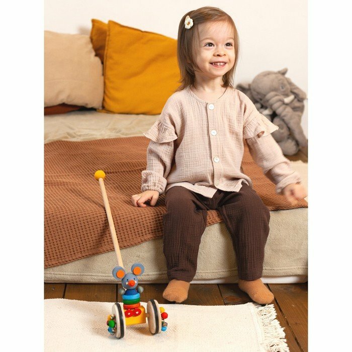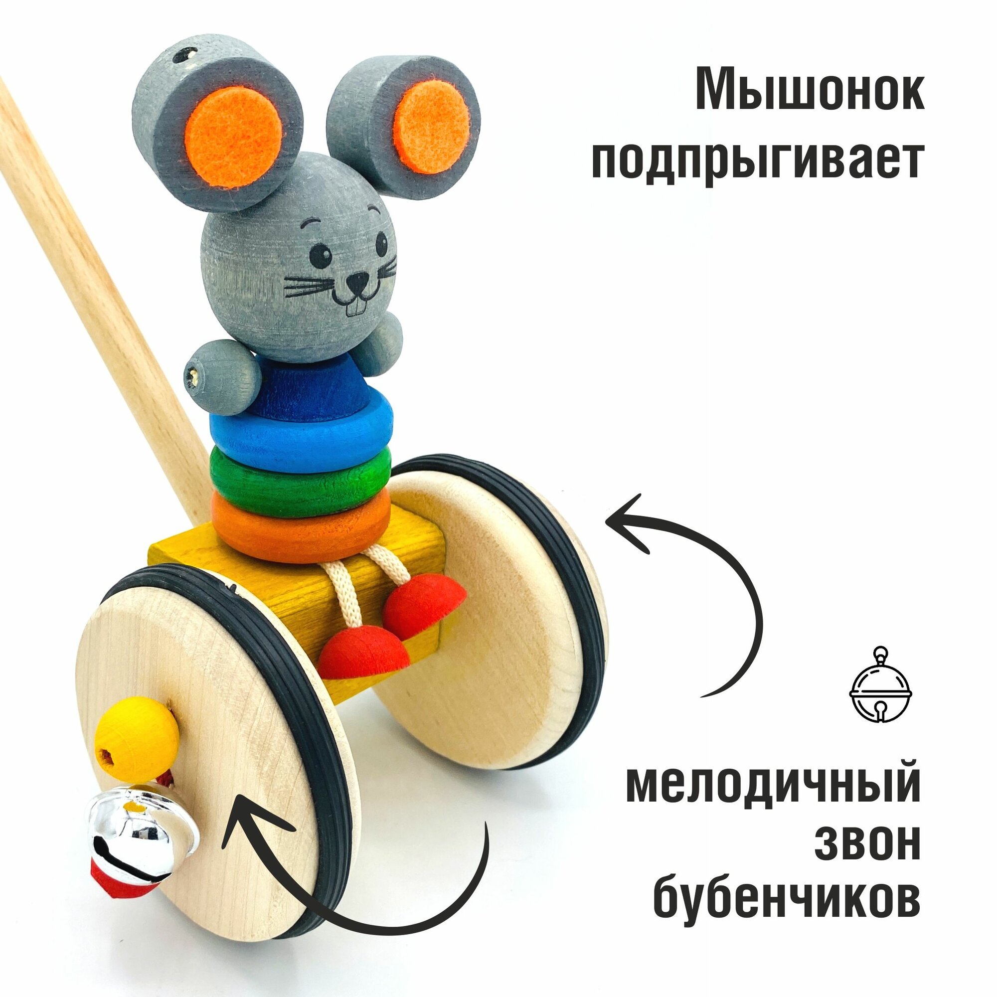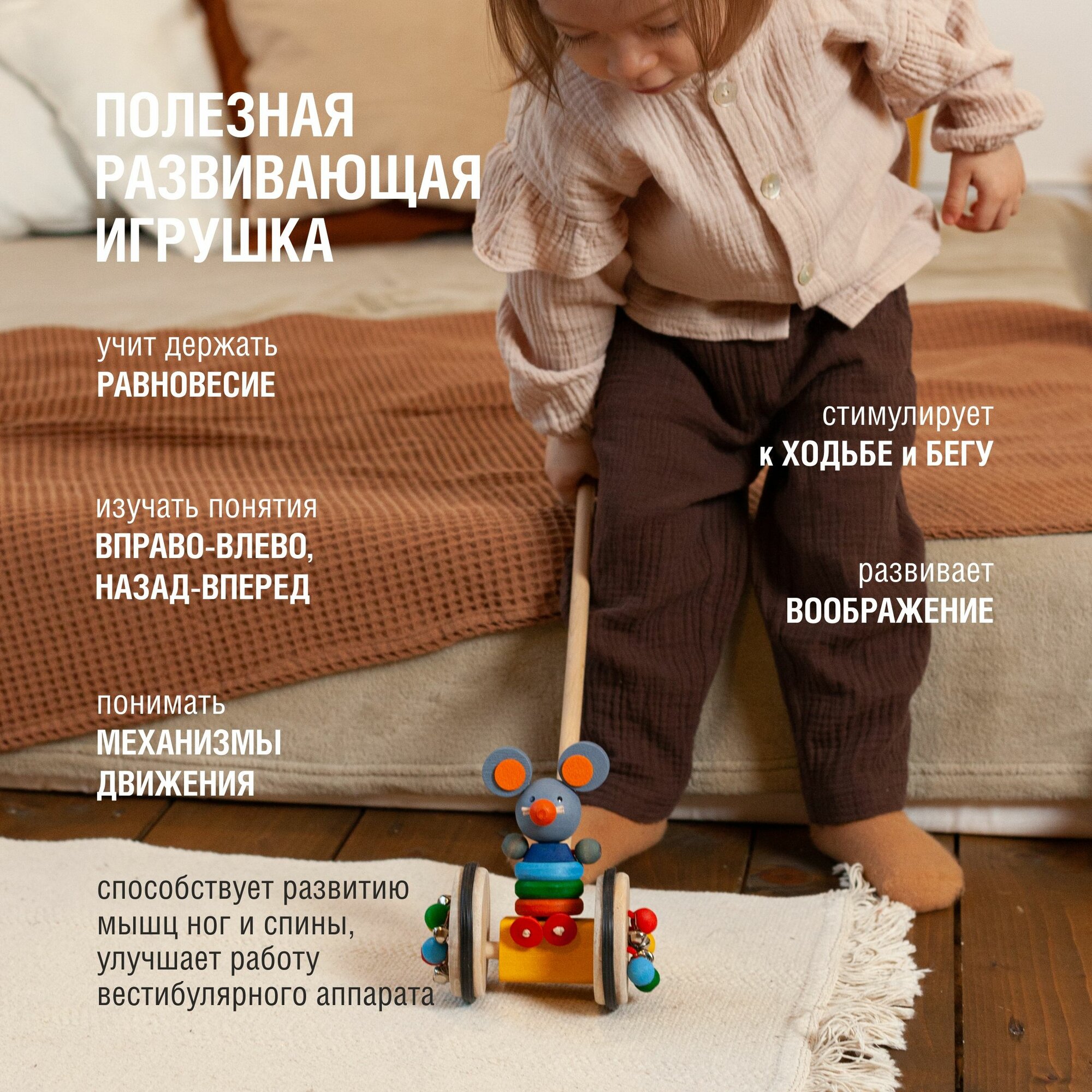 Забавный мышонок станет не только верным спутником Вашему малышу дома и на прогулках, но и поможет его всестороннему развитию. Каталка научит держать равновесие, понимать механизмы движения, обучит терминам назад-вперед, направо-налево. Поможет развить координацию и воображение.
