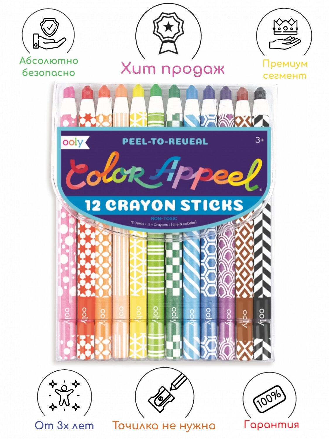 Красочные мелки Color Appeel изготовлены из высококачественного воска, благодаря чему цвета получаются яркими, а поверхность рисунка гладкой. Точилка больше не нужна! Как только грифель сточится, просто потяните за бумажную ленточку на корпусе, чтобы обновить грифель. Абсолютно безопасно для детского творчества.