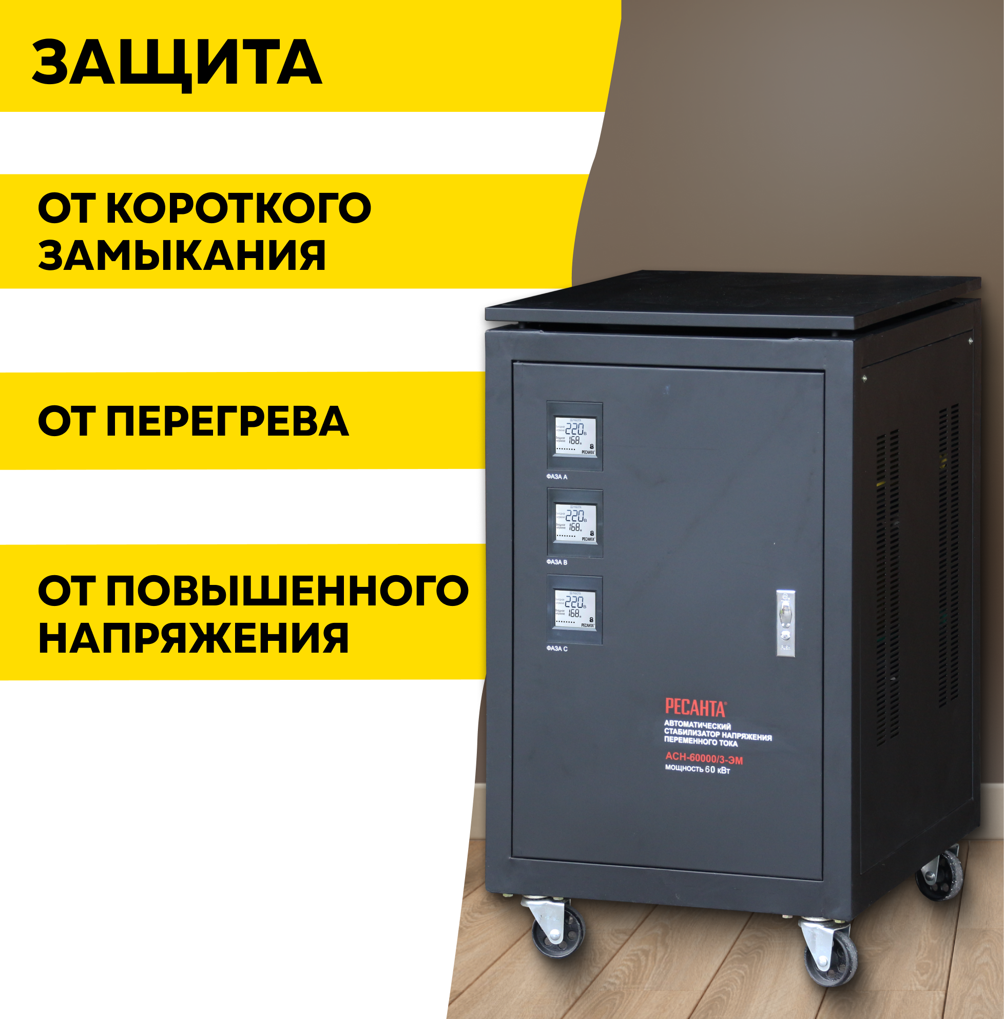 Стабилизатор Ресанта АСН-60000/3 – это мощный, стационарный трехфазный стабилизатор, который служит для защиты различных потребителей в условиях нестабильного по значению напряжения питающей сети 380В. Данный стабилизатор рекомендуется использовать в частных домах, больницах, мастерских, медицинских учреждениях для оборудования с общей мощностью не более 60 кВт.