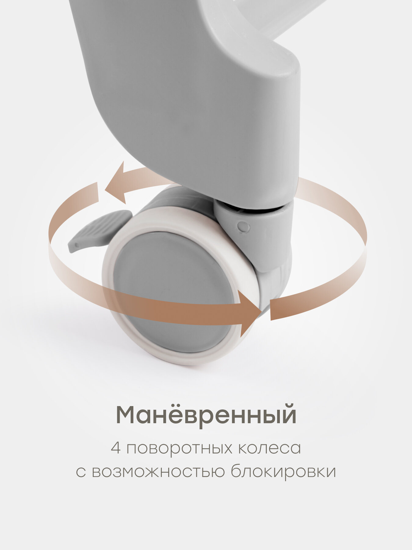 Цельнолитая металлическая рама без спаек и острых углов безопасна и выдерживает повышенную нагрузку до 25 кг. Задние поворотные колеса обеспечивают мобильность и оснащены тормозным механизмом, а передние – не поворачиваются, что добавляет стульчику устойчивости.
