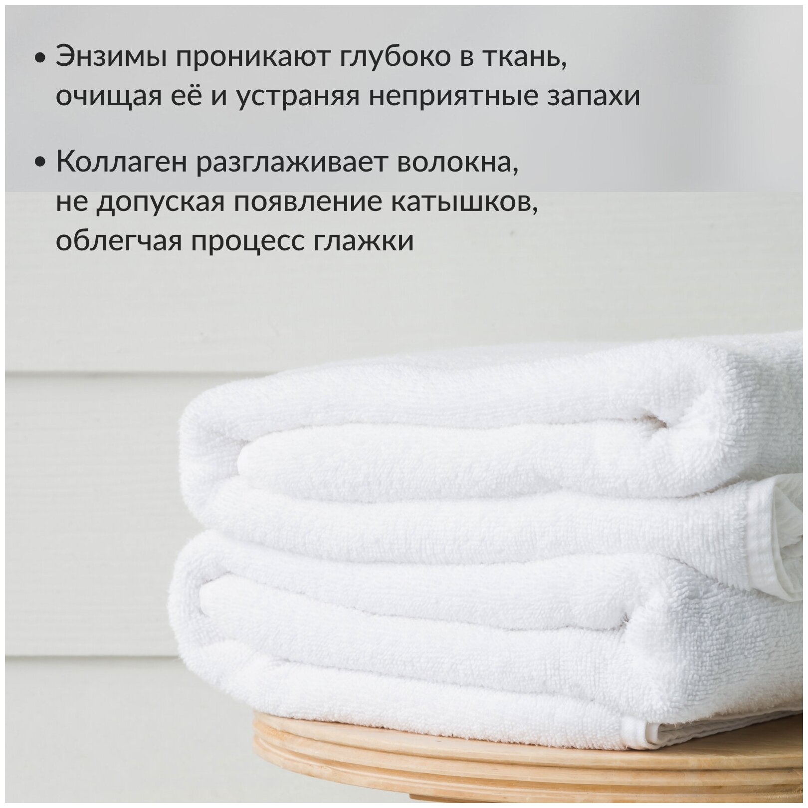 Энзимы проникают глубоко в ткань, очищая её и устраняя неприятные запахи. Коллаген разглаживает волокна, не допускает появление катышек и облегчает процесс глажки белья, создает на одежде тончайший слой, который предотвращает оседание грязи и выполаскивание пигмента из ткани. Комплекс арома-масел придаёт белью тонкий и ненавязчивый аромат.
